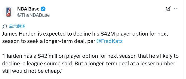 北京時間4月17日,據The Athletic(TA)報道,聯盟消息人士透露:哈登下賽季擁有4200萬美元球員選項,他大概率會選擇跳出。即便後續簽下一份年薪更低的長期合同,薪資總價依舊不菲。