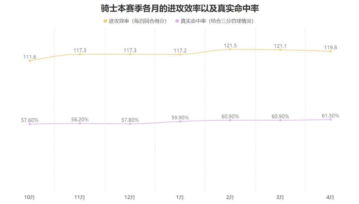 騎士從2月份以來的進攻效率以及真實命中率顯著的高於1月份之前,這意味着自從哈登加盟後騎士每百回合的得分數以及結合三分與罰球后的得分效率顯著的提升,對於進攻的增幅作用是哈登帶來的最大意義,這也令2月份以來騎士的進攻水準達到了更高的級別。