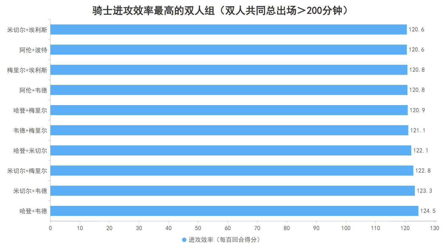 在騎士本賽季出場時間超過200分鐘的球員中,進攻效率最高的四對二人組都有哈登或米切爾的參與,這意味着兩人無論誰在場都能令騎士的整體進攻達到最高的水準,作爲一支防守天賦不算最頂級的陣容配置他們更需要進攻的火力,雖然騎士的幾名主力球員名氣不算更大但這個陣容的結構卻需要哈登並且也能成爲哈登衝擊冠軍的基本盤。