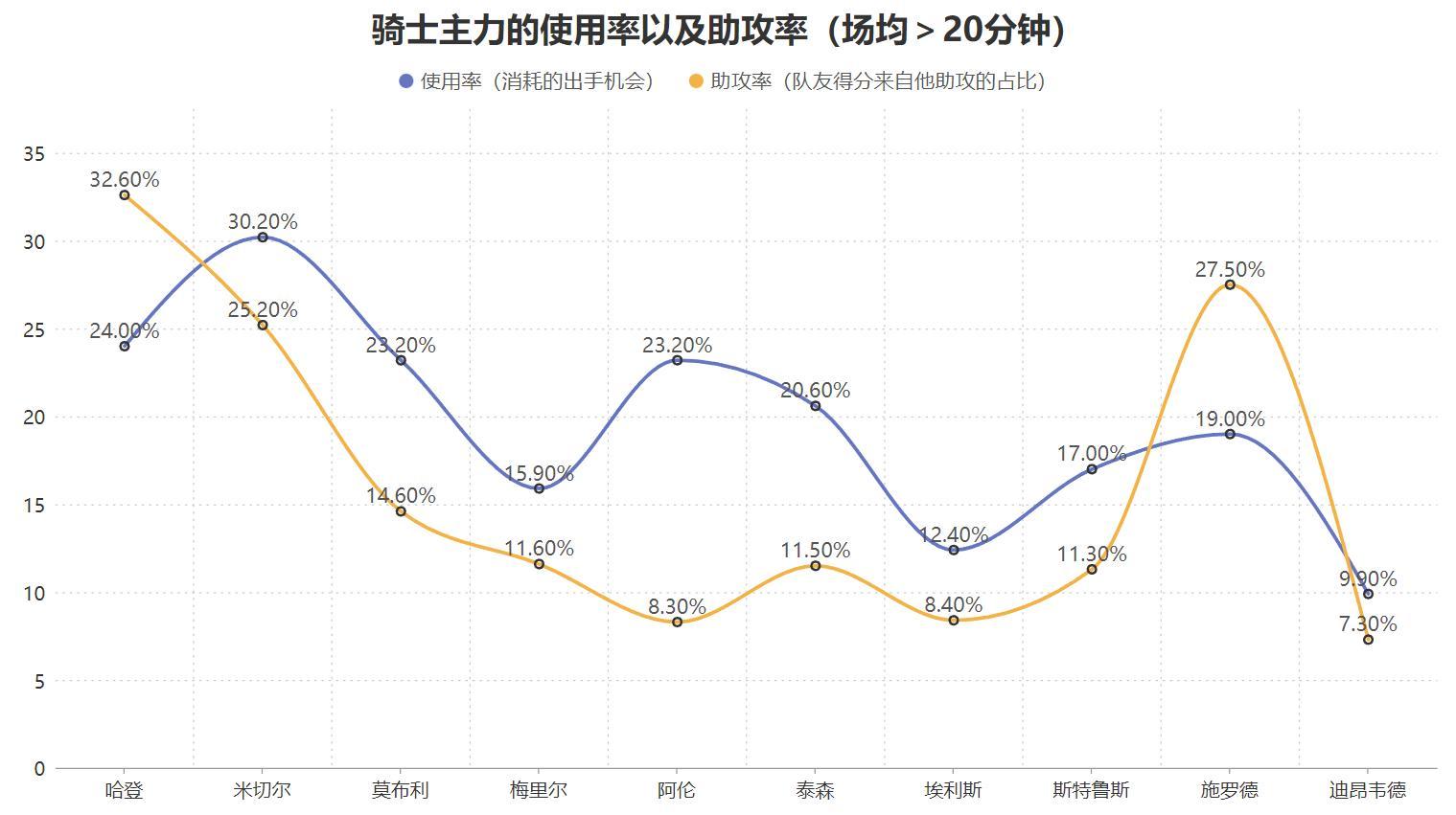 哈登加盟騎士後有着24%主力第二高的使用率,同時32.6%的助攻率位於主力第一高,而他的後場搭檔米切爾則分別位於第一與第三高,這意味着哈登與米切爾兩人接管了騎士隊大量的進攻發起和終結,只要騎士保持陣容的健康那麼在場上就一定有一名得分助攻一手抓的進攻梳理者,相比於加蘭哈登的組織串聯以及得分能力更加穩定。