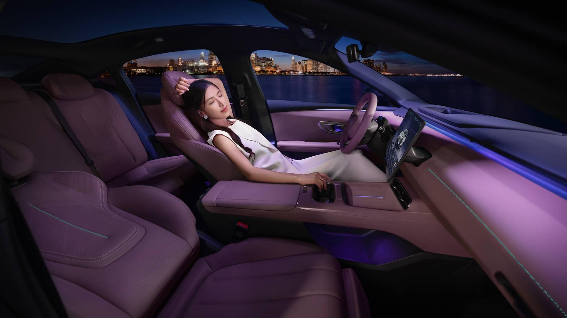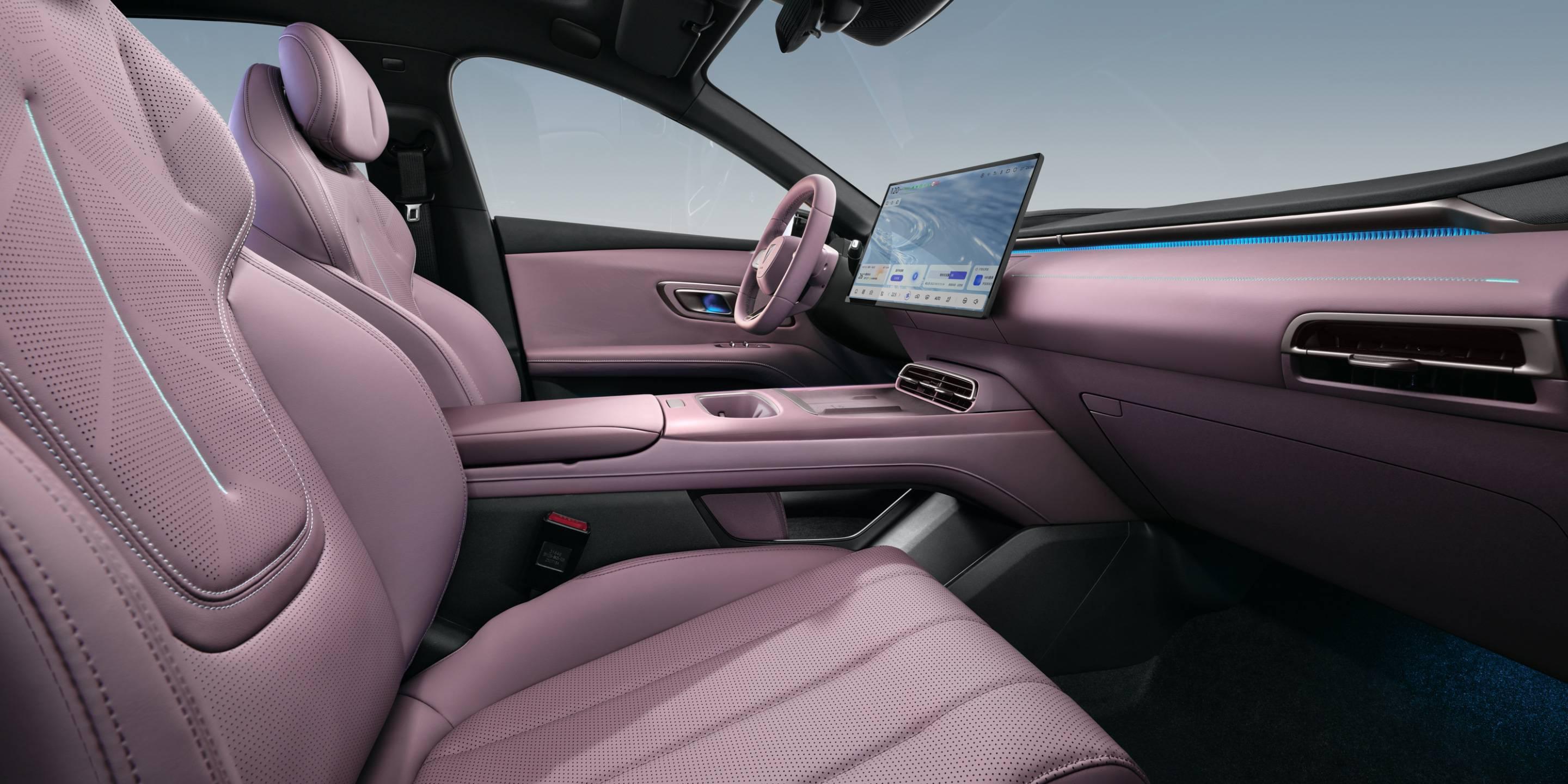 走進車內,新車座艙爲經典的 T 字形佈局,提供煙晶霧灰、月光石白、舒俱來紫三種配色,副駕配備了零重力座椅,支持 8 點式按摩,並搭載了 18 揚聲器音響、256 色氛圍燈等配置。