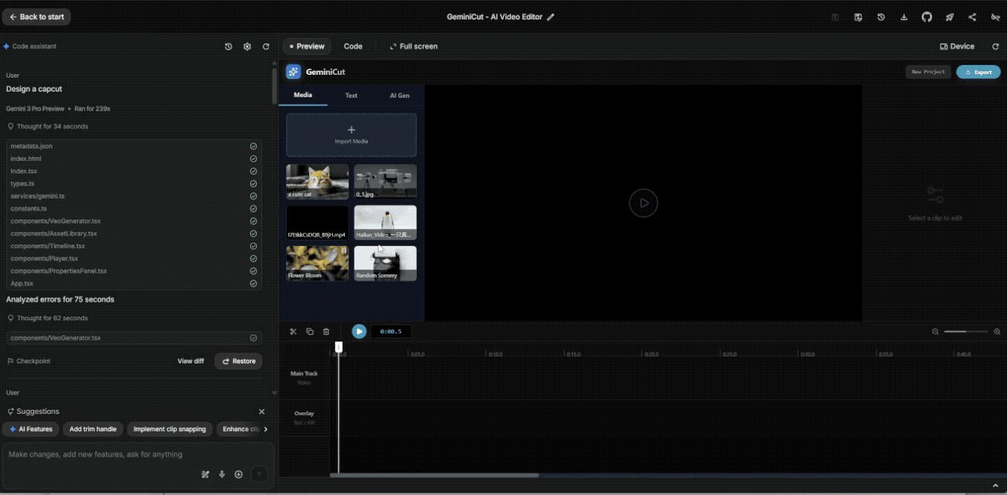 網上更火的 Gemini 3.0 Pro 測試,是有一個博主,在 Gemini 裏面輸入一句「Design a Capcut(設計一個剪映)」,然後只花了 239 秒,就復刻了一個能真實使用的剪映。完全不需要我們再打磨提示詞,去詳細列出應該做哪些功能,交互邏輯是如何,配色方案等;直接一句話搞定。