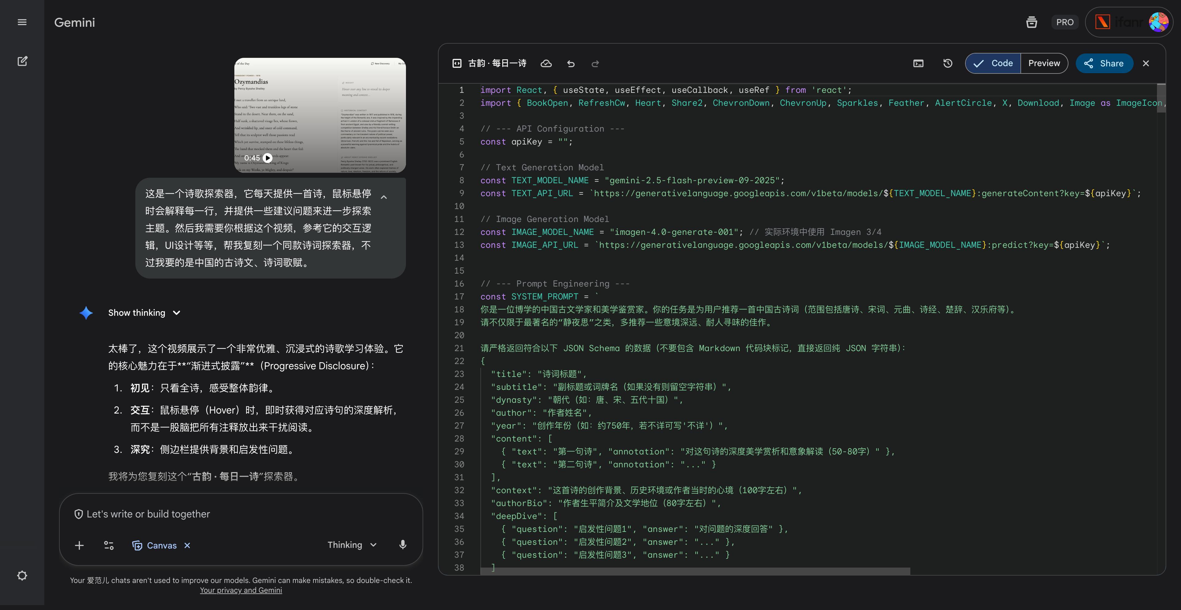這已經不是單純的單頁 HTML 文件,它需要 Gemini API 來同步完成詩歌的選擇推薦,以及圖片內容的生成。我相信這是目前無論哪個 AI 編程工具、或者 ChatGPT,都無法實現的強大功能。