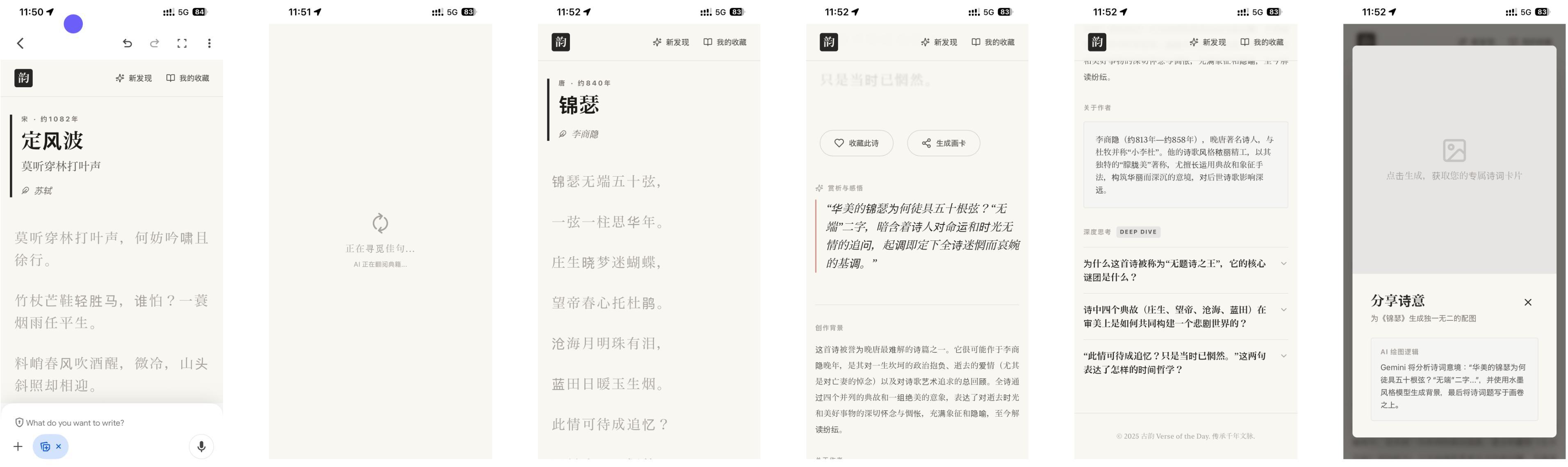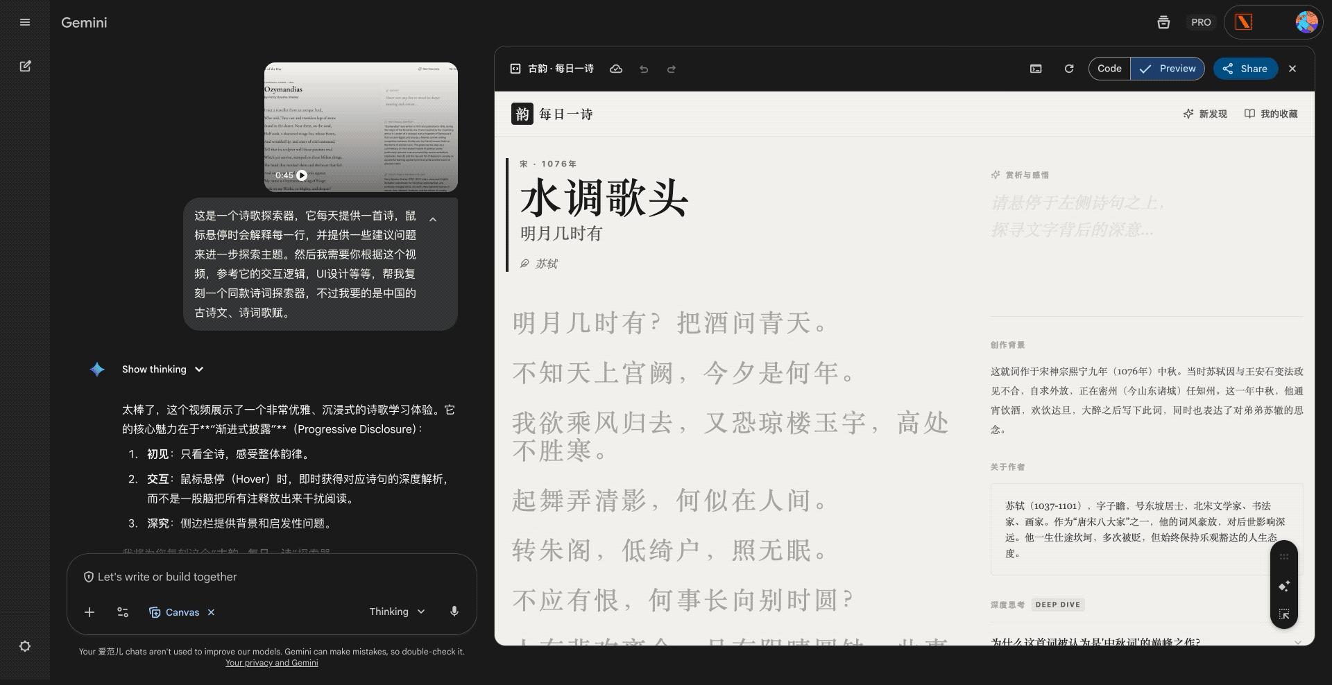 提示詞:上傳已有視頻,並加上「這是一個詩歌探索器,它每天提供一首詩,鼠標懸停時會解釋每一行,並提供一些建議問題來進一步探索主題。然後我需要你根據這個視頻,參考它的交互邏輯,UI 設計等等,幫我復刻一個同款詩詞探索器,不過我要的是中國的古詩文、詩詞歌賦。」
