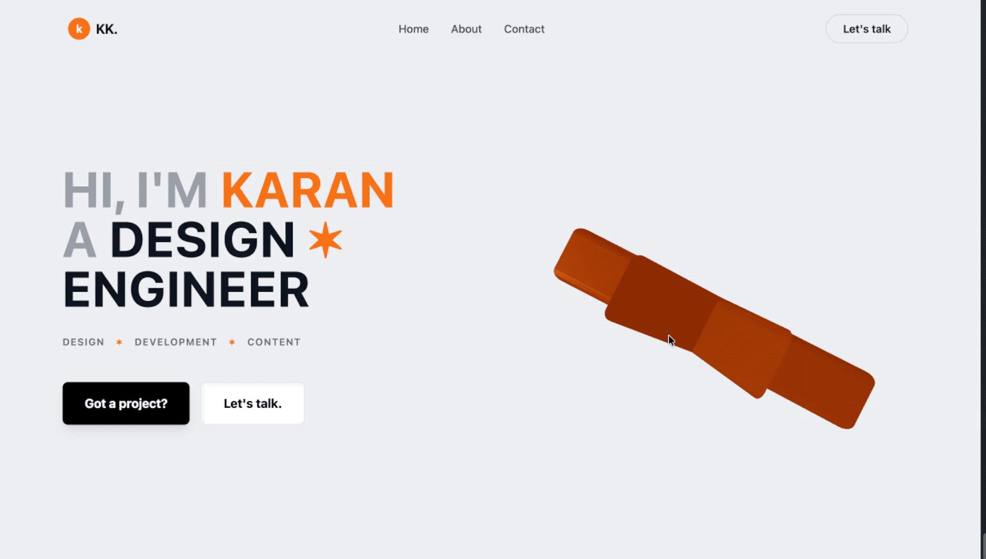 提示詞:Create a hero section with a two-column responsive layout: left side has a large bold heading with orange accent highlights and star symbols, a tagline row with uppercase tags, and two CTA buttons (primary black, secondary white with border). Right side features a 3D animated orange star using React Three Fiber with slow rotation and float animations, orbit controls, and a subtle background glow. Include a top navigation bar with logo, menu items, and a “Let’s talk” button. Use Tailwind CSS for styling with a light gray background, generous spacing, and smooth hover transitions.|圖片來源:X@karaan_dev