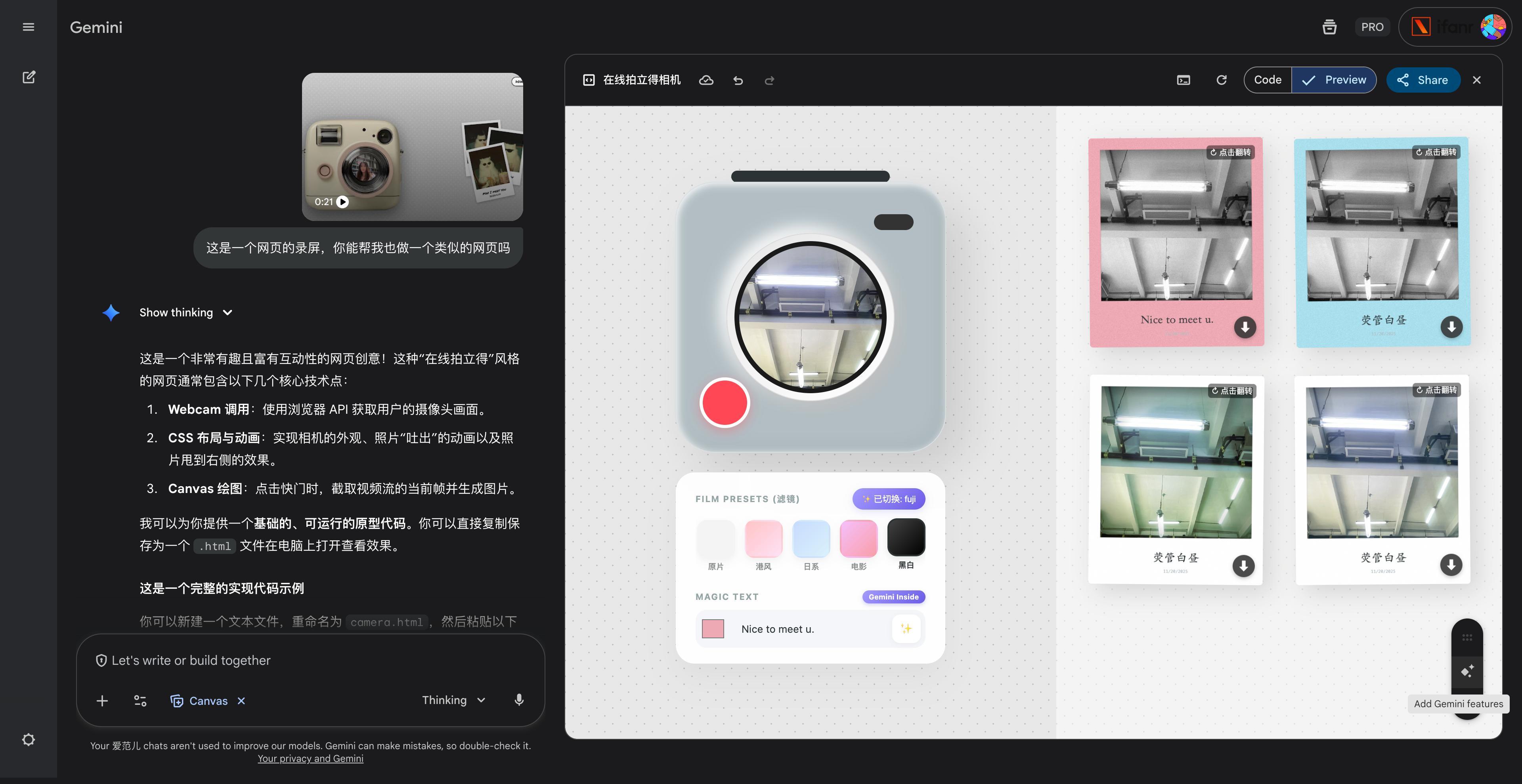 當我們把這個視頻直接發給 Gemini 3.0 Pro,它竟然也可以很快,就生成一個同款。並且在 Canvas 裏面,還支持添加 Gemini 功能,因此我們這個拍立得,還有了 AI 識別攝像頭畫面,主動生成文案和選擇濾鏡的功能。