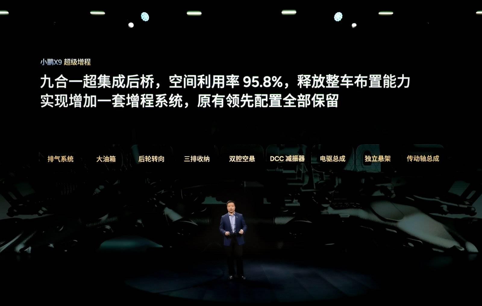 小鵬爲此研發了一套名爲「鯤鵬超級集成架構」的工程方案。其後橋採用全球首創的「9 合 1」設計,將增程器排氣系統、60L 油箱、主動式後輪轉向、第三排 4/6 分獨立電動座椅收納機構、雙腔空氣懸架、智能可變阻尼減振器、同軸電驅總成、H 臂多連桿獨立懸架以及傳動軸等九大功能模塊,高度集成於同一緊湊區域,整體空間利用率達 95.8%,在保障性能的同時,最大限度釋放了乘員艙與行李空間。