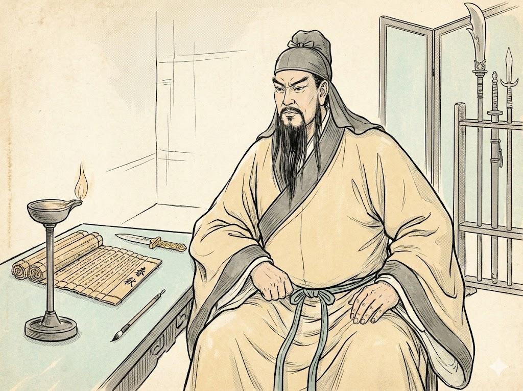 提示詞:仿古籍線描插圖風,關羽坐於油燈旁,身披寬袖戰袍,神態專注沉穩。桌案上擺着《春秋》竹簡、鎏金小刀、毛筆等器物,以纖細線條勾畫,保留古印刷風格。背景僅以幾筆勾勒牆角、屏風與兵器架,簡潔卻富古雅氣息。色彩以淺赭、灰墨、淡青爲主,呈現古書插畫的文化韻味與歷史感,4:3。