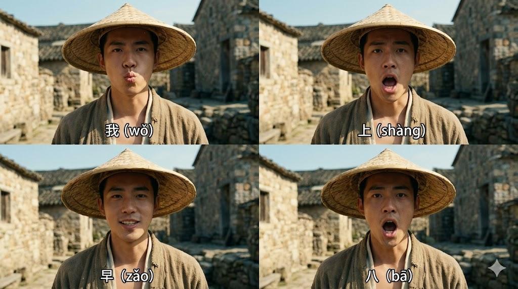 提示詞:請繪製一張四宮格圖片,四張圖依次表現同一位戴着斗笠的年輕男子分別發音「我」「上」「早」「八」,人物外貌保持一致,口型準確對應每個字的發音,整體風格統一,16:9,4K