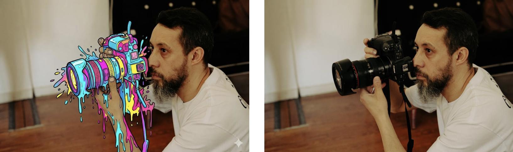 提示詞:Transform the [camera] from the uploaded photo into a bold, colorful cartoon illustration style, while keeping the rest of the photo realistic and unchanged. Cartoon style details: thick black outlines, vibrant flat colors (such as bright cyan, magenta, yellow, pink), dripping paint and splash effects, playful comic-book energy. most drips flow downwards.The cartoon object should look like it is melting or bursting with colors, blending naturally into the real photo. Keep all other elements (background, other objects, environment) photorealistic with no alterations. High resolution, pop-art aesthetic, surreal contrast between realism and cartoon.
