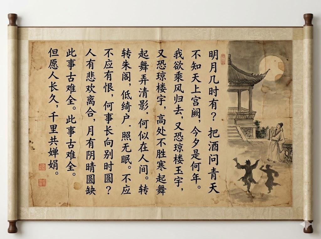 提示詞:生成一幅 4K 古畫,畫上寫着:明月幾時有?把酒問青天。不知天上宮闕,今夕是何年。我欲乘風歸去,又恐瓊樓玉宇,高處不勝寒。起舞弄清影,何似在人間。轉朱閣,低綺戶,照無眠。不應有恨,何事長向別時圓?人有悲歡離合,月有陰晴圓缺,此事古難全。但願人長久,千里共嬋娟。