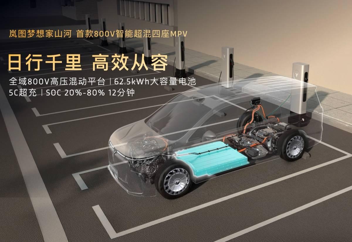 嵐圖夢想家山河的三電系統與新款嵐圖夢想家系出同源,配備有 62.5 度電池,搭配 5C 超快充技術,從 20% 至 80% 電量補充僅需 12 分鐘。