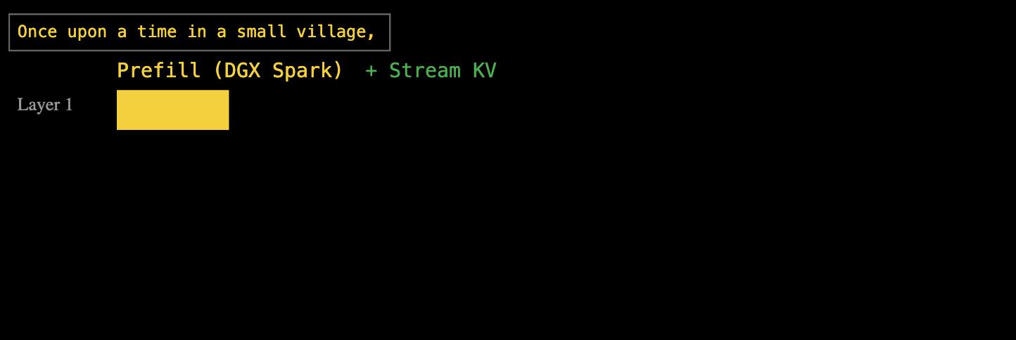 EXO 的答案是:流水線式分層計算與傳輸。DGX Spark 在處理第一層預填充時,計算出的 KV 緩存會立即開始傳輸給 Mac Studio,而 DGX Spark 則繼續進行第二層的預填充工作。