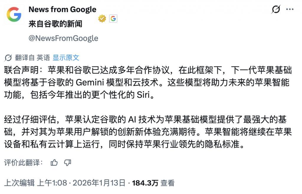 好在這次,蘋果不再單打獨鬥。今年年初,蘋果和 Google 正式達成多年深度合作,下一代「蘋果基礎模型」將直接基於 Google 的 Gemini 模型和雲技術構建。