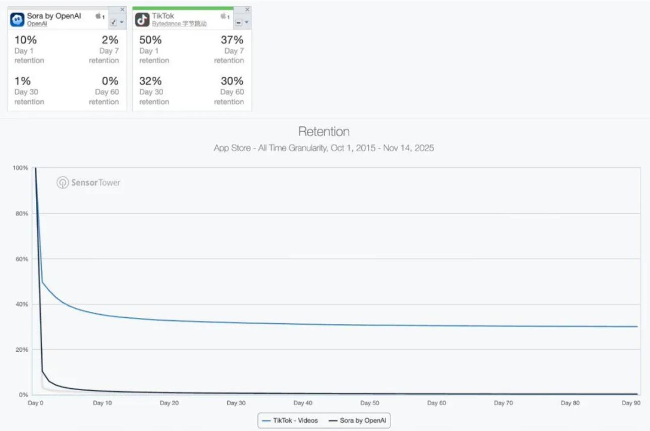 數字不會說謊,上線後,這種擔憂也逐漸變成了事實。硅谷風投機構 a16z 合夥人 Olivia Moore 在社交媒體上曬出一張 SensorTower 的監測截圖:Sora APP 的 30 天用戶留存率僅爲 1%,60 天留存率直接歸零。