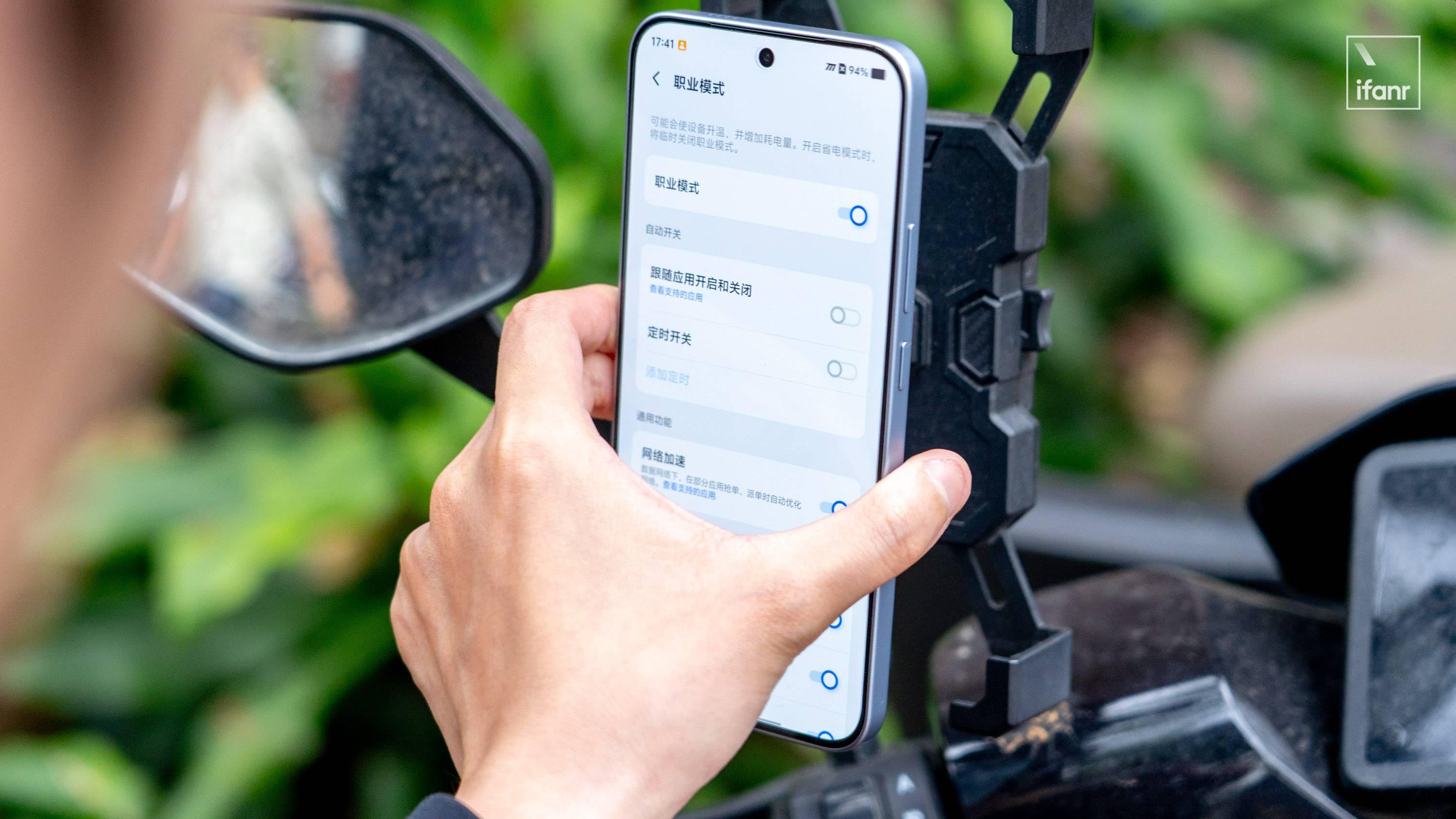 系統內提供了「職業模式」功能,適配常用的騎手和網約車軟件,除了用於提升顯示亮度,還配備了免提通話增強、優化網絡配置和電量在 80% 後開啓直供電等功能。