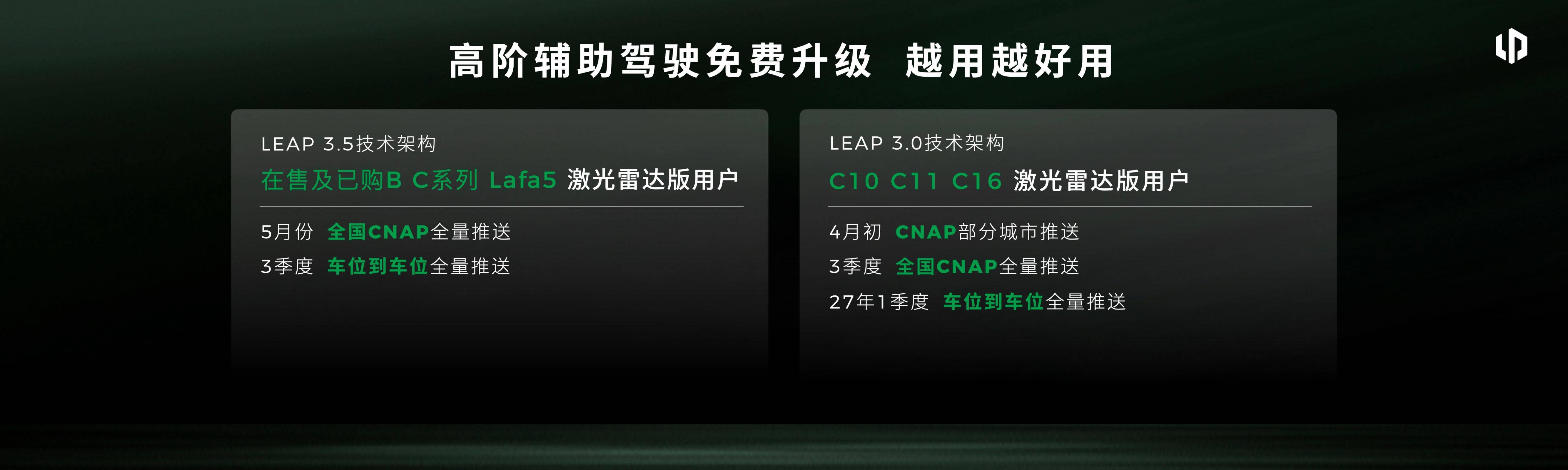 搭載 LEAP3.5 技術架構的零跑汽車產品將於 3 季度實現車位到車位的高階輔助駕駛全量推送;搭載 LEAP3.0 車型將於 2027 年車位到車位的高階輔助駕駛全量推送。
