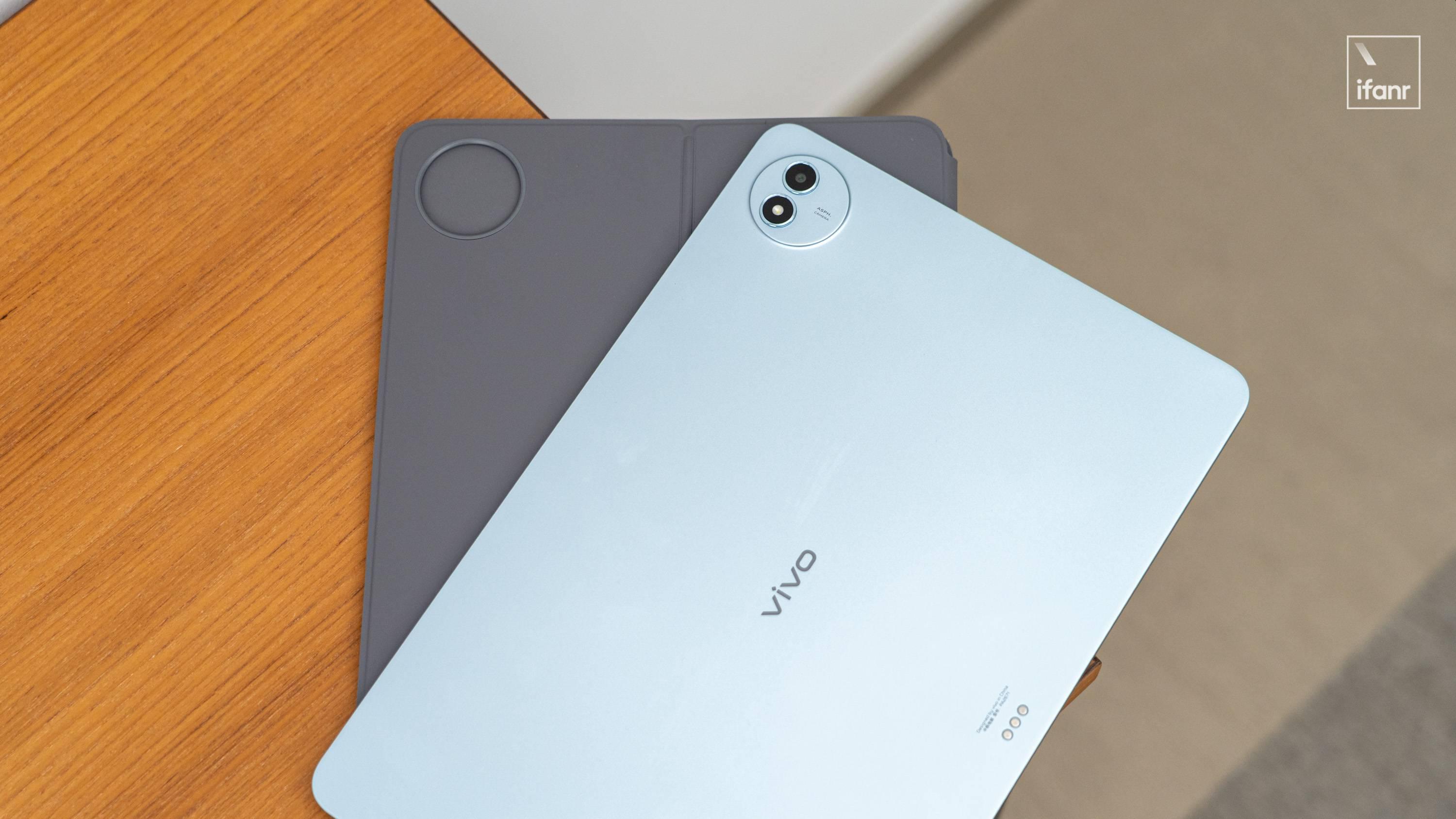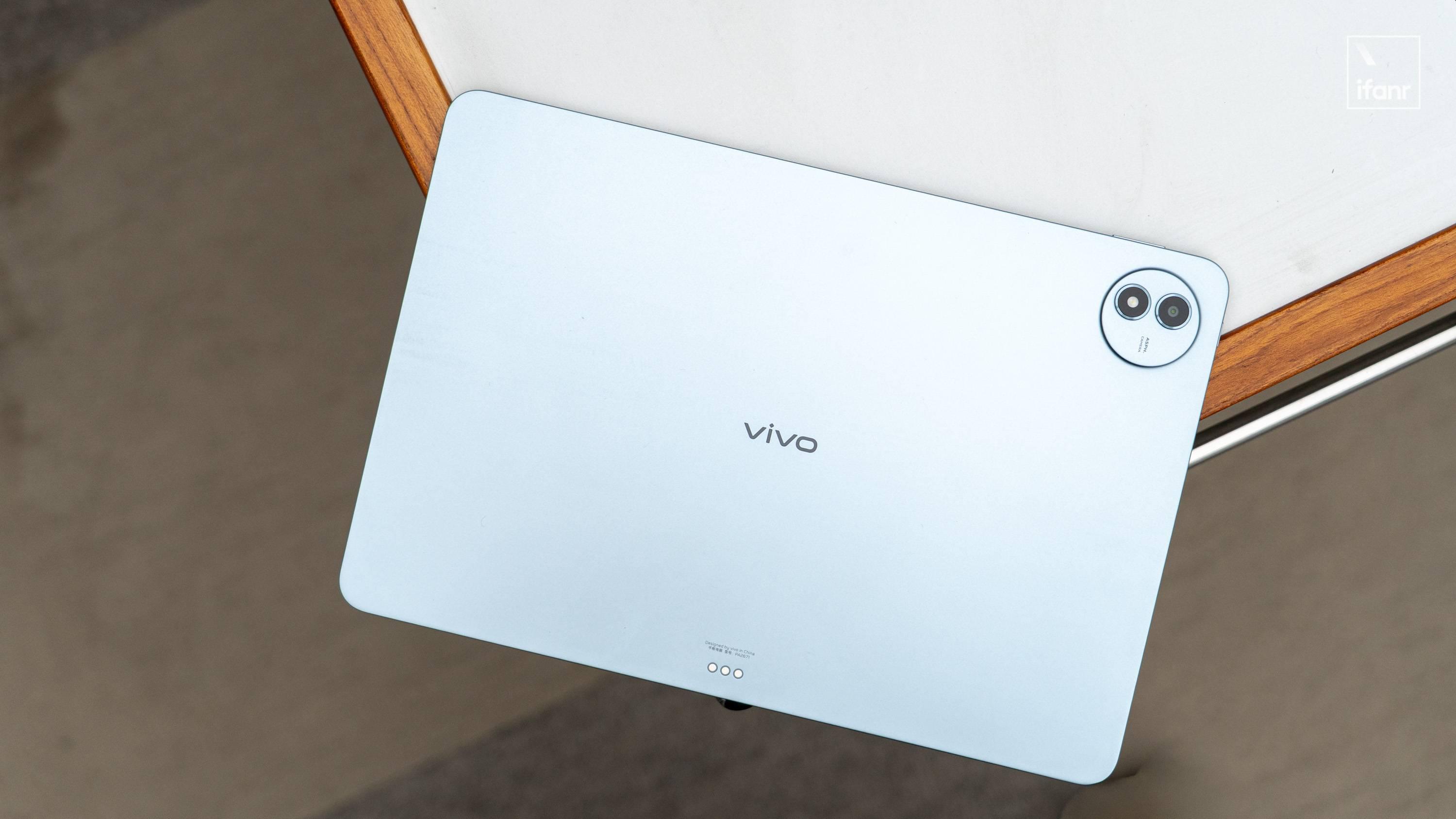 vivo Pad6 Pro 的後側是一塊帶磨砂顆粒處理的光滑金屬後蓋,中心位置放了橫向的 vivo LOGO,右上側搭載攝像頭和補光燈的圓形 DECO。底邊上有三個連接保護套和配件的 Pogo pin 金屬觸點。