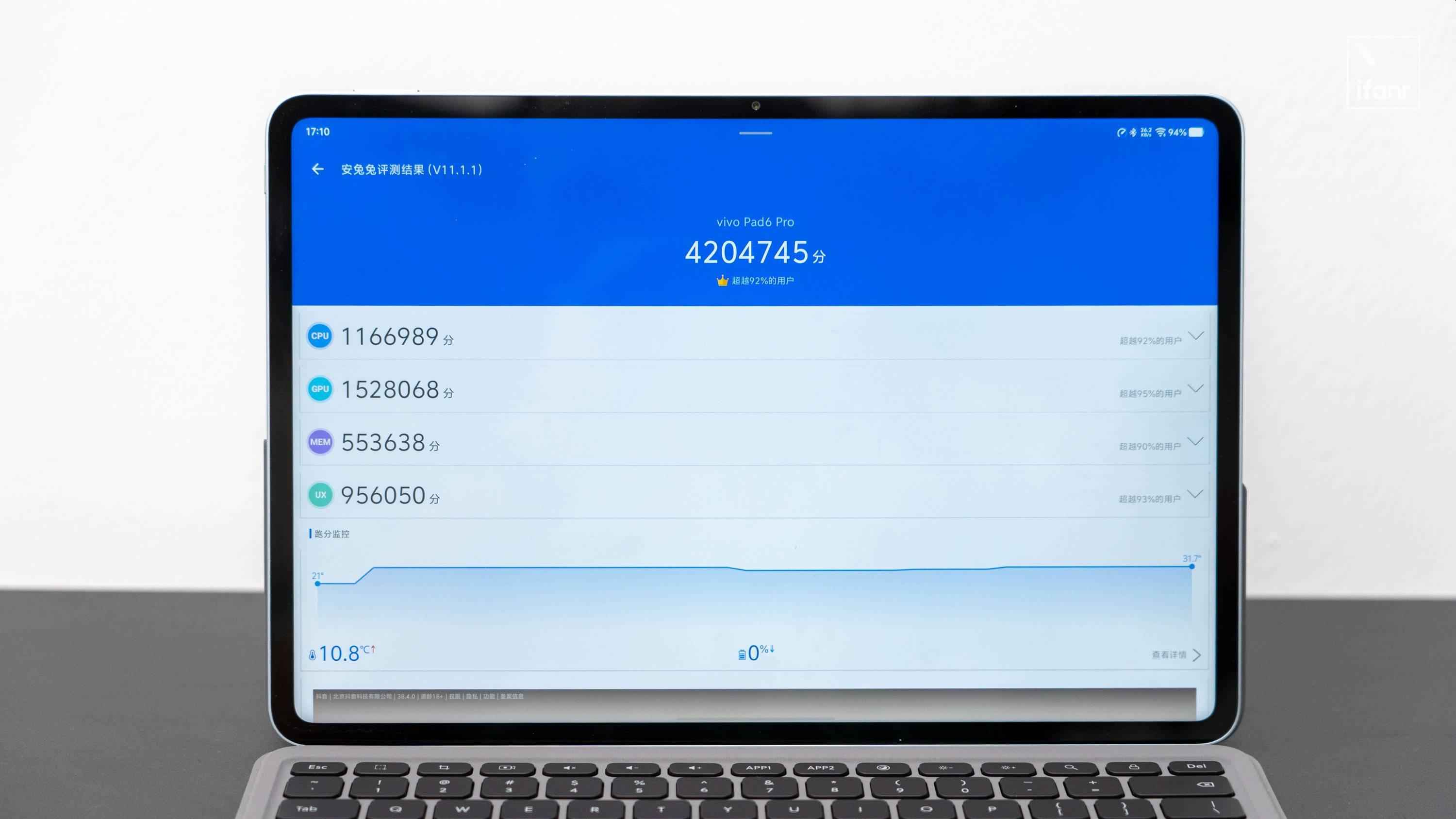 性能方面,vivo Pad6 Pro 在室內常溫狀態下開啓性能模式,安兔兔跑分爲 4204745。