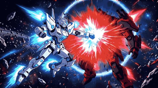 藍色等離子重擊胸腔,爆炸衝擊波以同心圓向外擴散,碎片與金屬殘骸四射,機甲受損後發出電弧噼啪聲與機械嘶鳴。視覺衝擊力和音效層次同步爆發,每一層都在推進戰鬥敘事,而不是隨機無腦的感官轟炸。