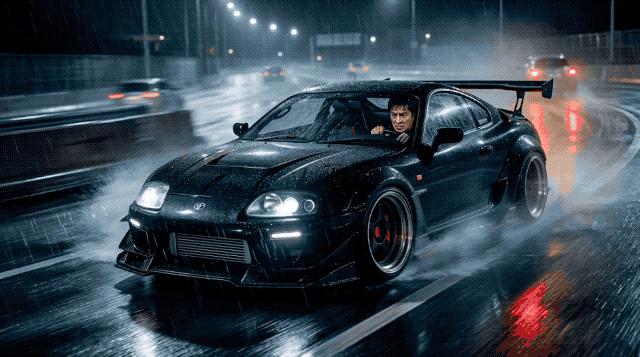 飆車戲裏,黑色改裝跑車以極速切入彎道,輪胎與地面摩擦發出刺耳嘯聲,後視鏡中出現追擊車燈越來越近,主角踩死油門,發動機轟鳴音調驟然拉高,車身側滑甩尾,水花在車身兩側炸開。
