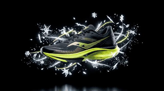 運動員從黑暗中衝出,每一步落地激起地面破碎的動力學特效,混凝土以衝擊點爲圓心炸裂,碎片向外飛散,鞋底離地瞬間爆發橙色殘影光軌。節拍鼓點與特效爆發點精確同步,每次落地等於一個鼓點。