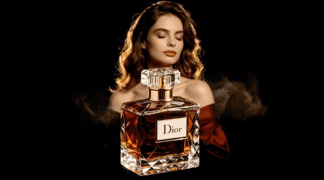 再比如這個香水廣告,在極致黑色場景,琥珀色液體超慢動作溢出,金霧粒子向四周飄散。大腦也因此自動補全了「奢侈品現場感」。