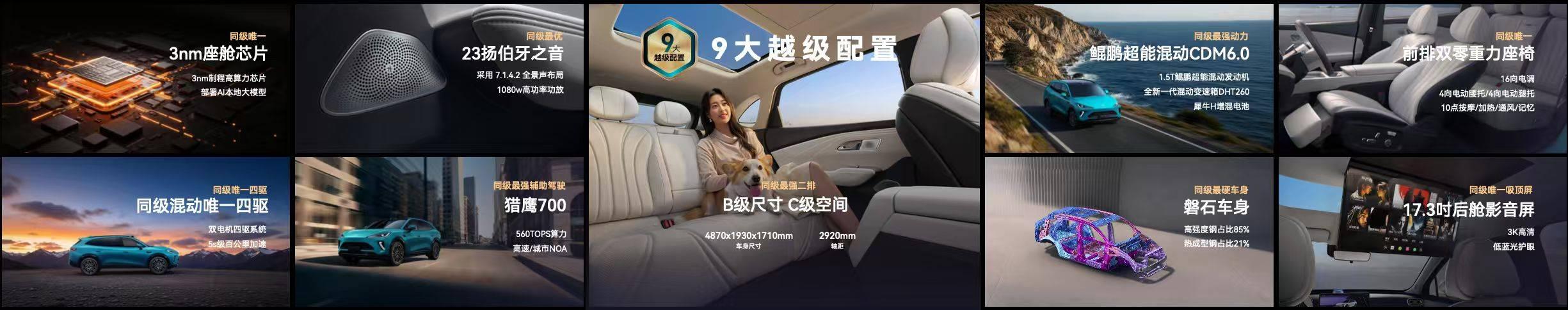 新車配備的是一臺 1.5 T 混動專用發動機,峯值功率 115 kW,峯值扭矩 220 N·m,熱效率達到 45.79%,並曾獲得「中國心」十佳發動機稱號。與之匹配的是全新一代 DHT 260 變速箱實測峯值轉速達到 26407 rpm,峯值功率 260 kW,峯值扭矩 330 N·m。