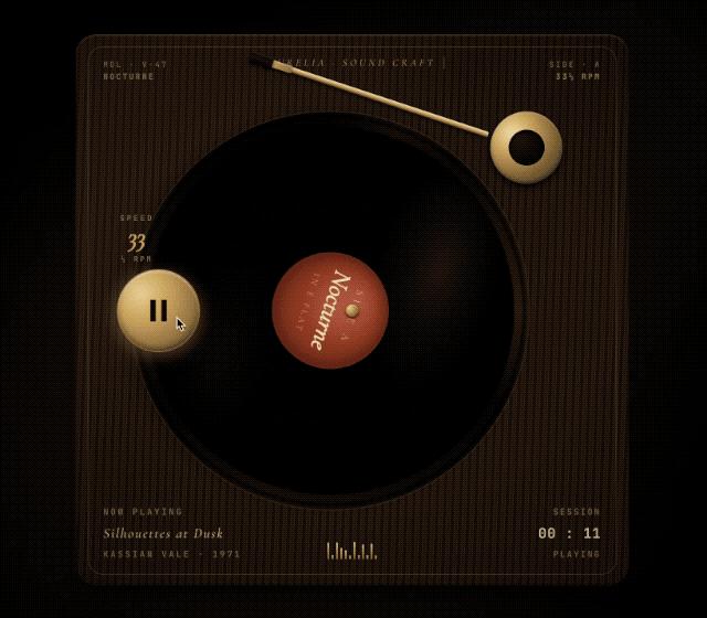 第一個場景,是讓它做一個俯視視角的黑膠唱片機界面,其難點在於「金屬光澤」與「呼吸光暈」的呈現。4.7 並沒有用廉價的色彩漸變敷衍了事,而是通過複雜的 CSS 樣式疊加,逼真地還原了金屬質感。
