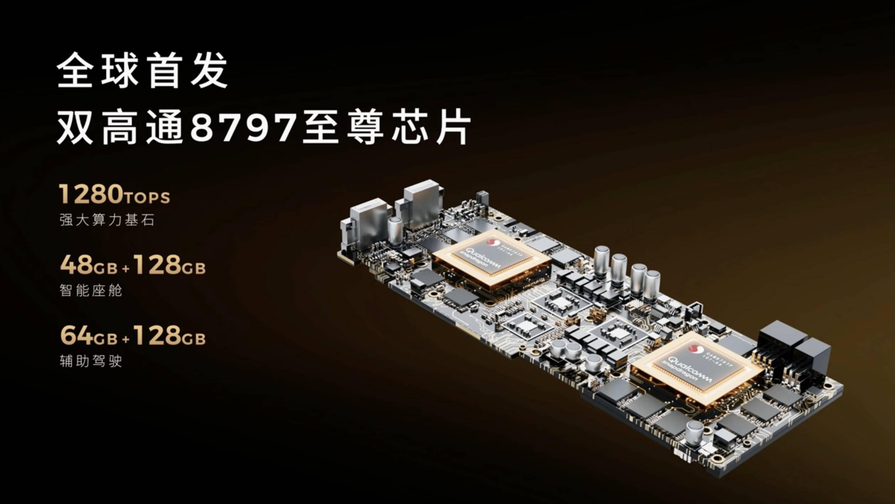如果你對算力有更高的渴望,頂配車型還會提供兩顆 8797 至尊版芯片,總算力達到驚人的 1280 TOPS。