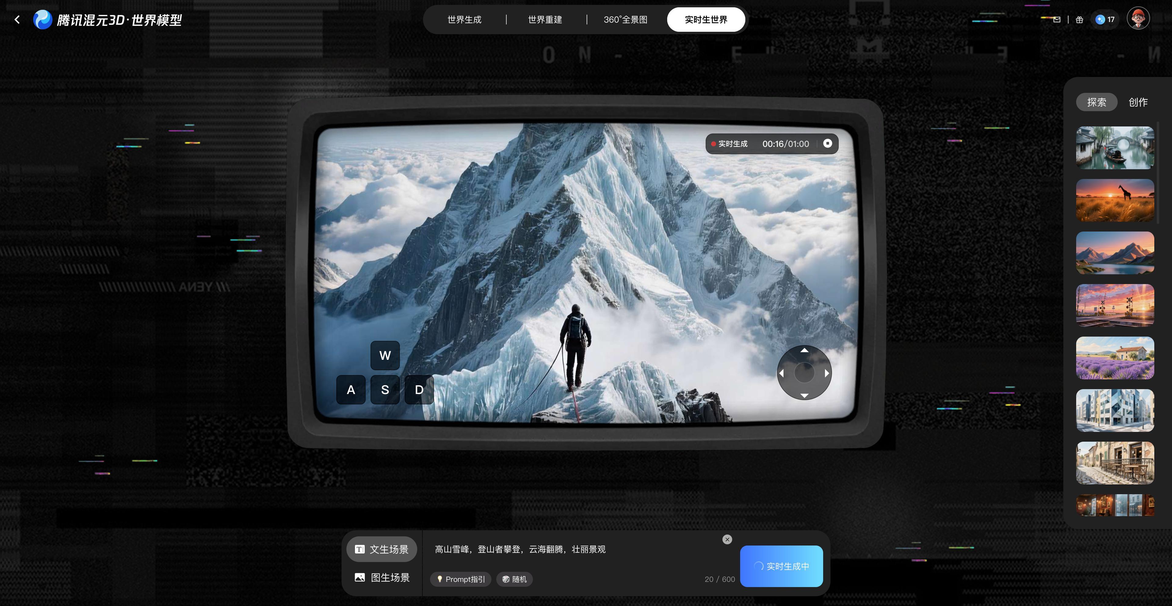 實時生世界時,我們能直接控制角色的行動,混元 3D 模型會自動生成對應的世界,單次生成的時長是一分鐘。
