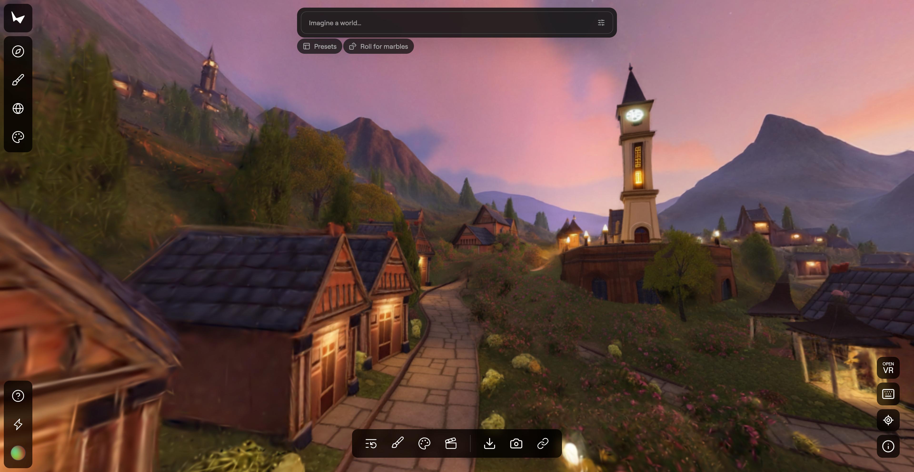 World Lab 生成界面,提示詞:吉卜力風格的山間小鎮,黃昏