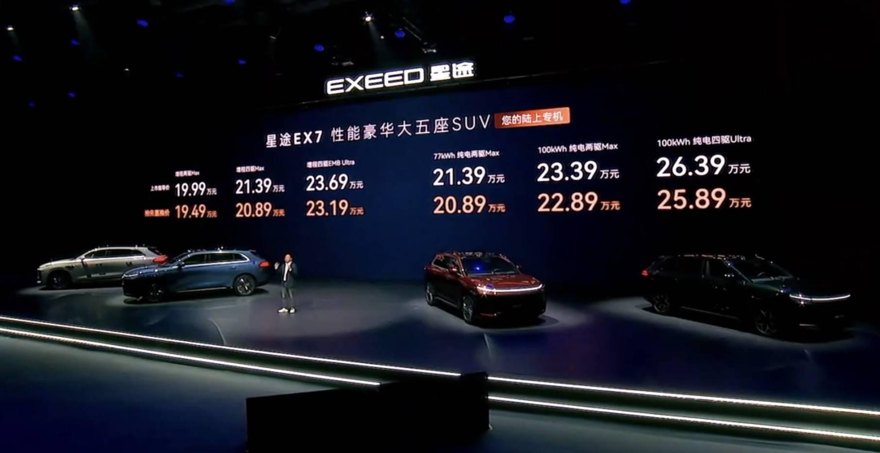 今晚,奇瑞星途品牌的全新車型——星途 EX7 正式上市。星途推出了純電與增程兩種動力共 6 款車型,官方指導價爲 19.99 萬至 26.39 萬元。