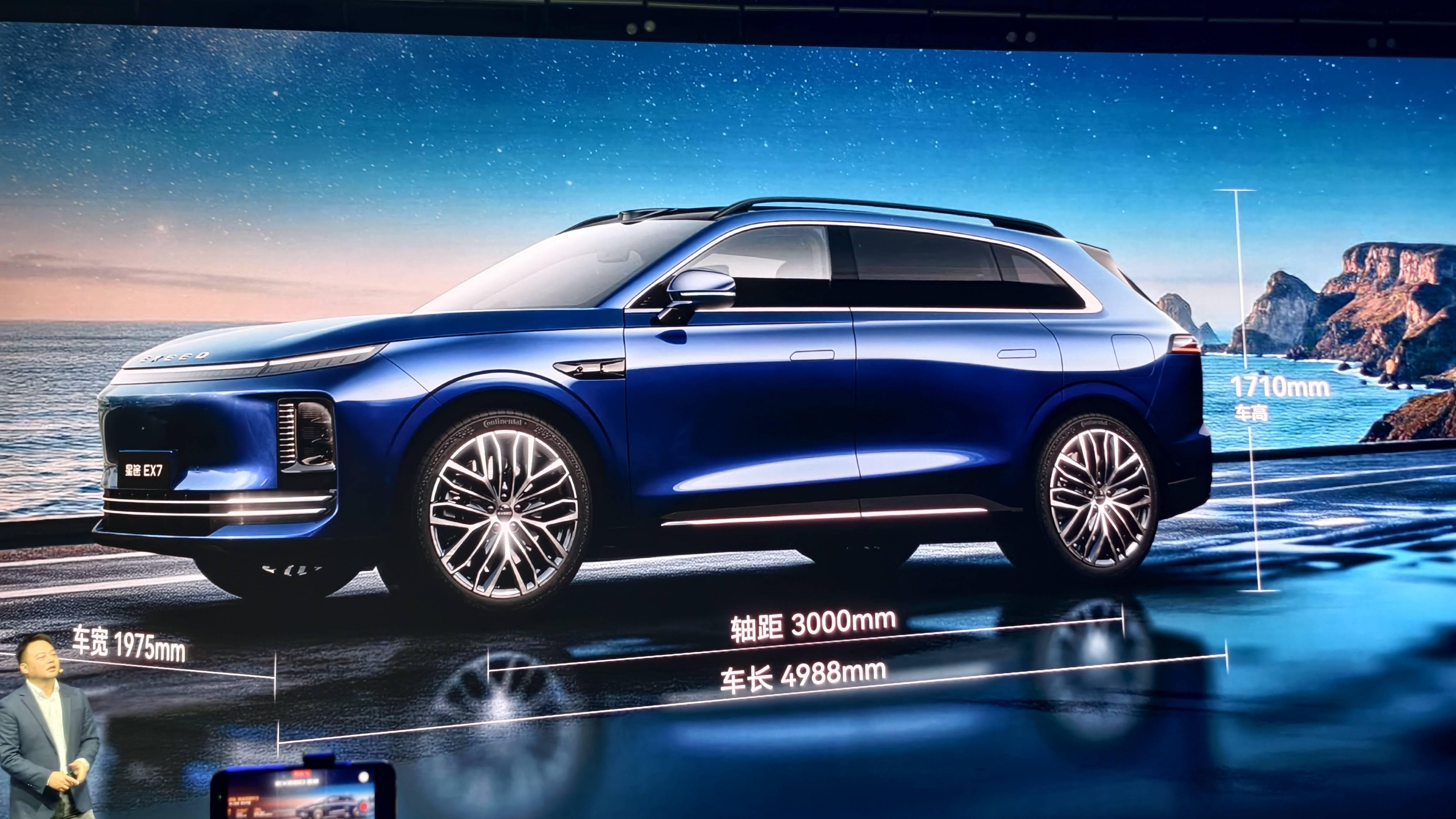 星途 EX7 採用了「星際美學」設計語言,長寬高分別達到了 4988mm、1975mm 和 1710mm,軸距長達 3000mm。在現場,高管團隊將這種車身比例簡單概括爲「532」。