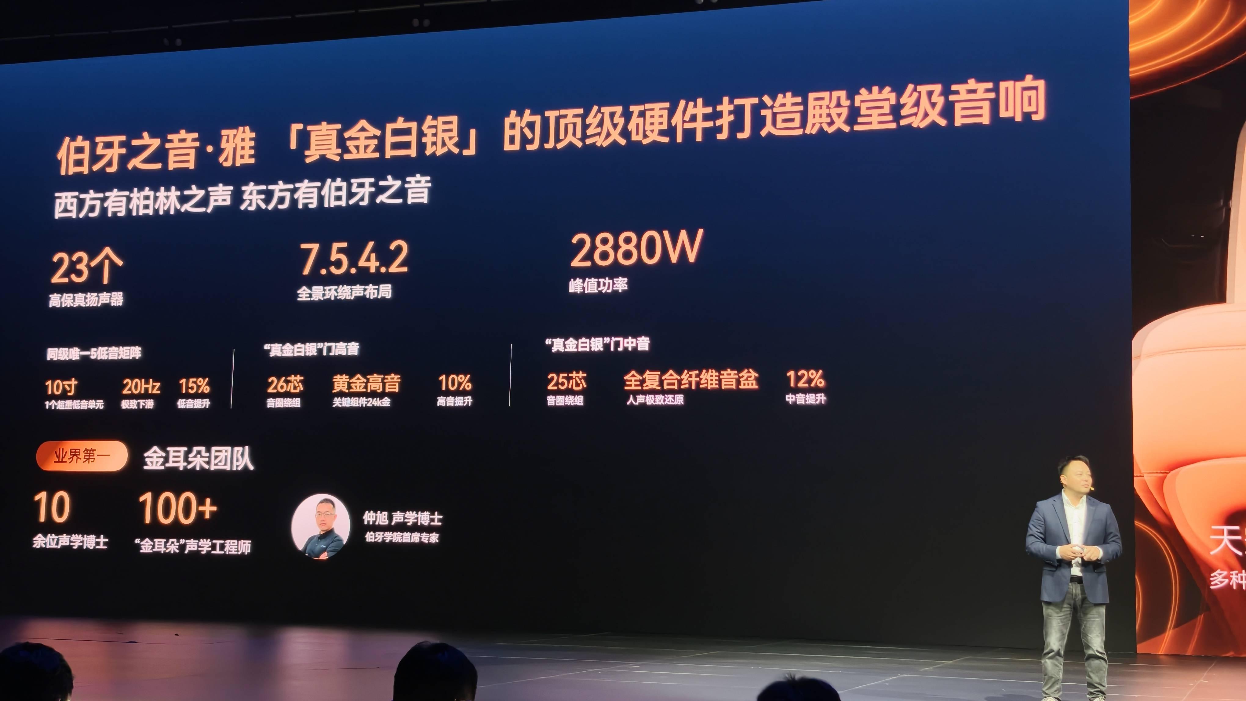 而在音響系統的硬件思路上,星途的做法也很典型。新車搭載了 23 個揚聲器的音響系統,爲了減少音頻信號的傳輸損耗,工程師在金屬插接線上使用了足金材質。