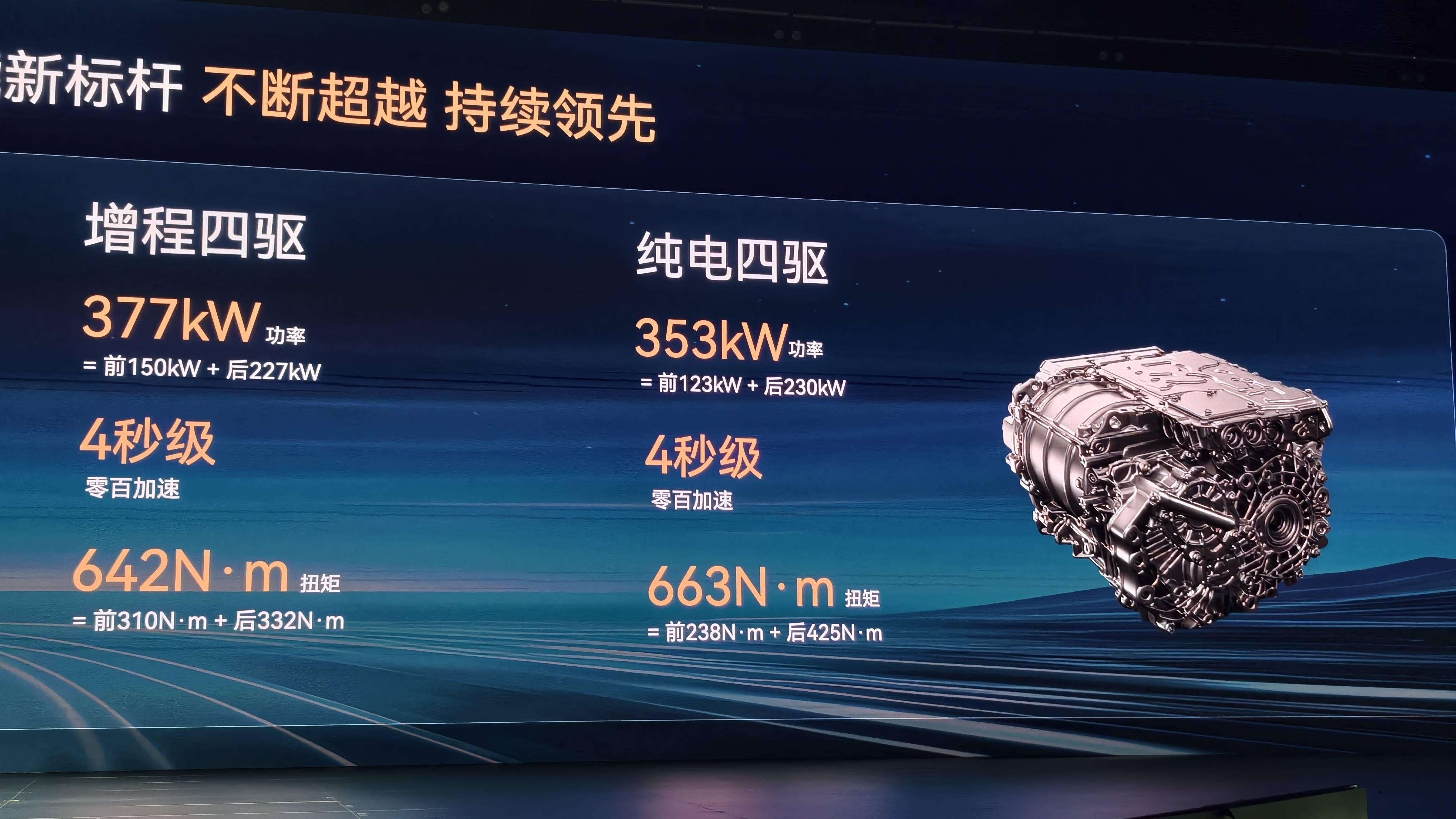 增程版搭載了一臺熱效率接近 46% 的 1.5T 發動機作爲增程器,配合 41.16 度的電池包,CLTC 純電續航在 225 到 245 公里之間。如果是四驅版本,電機總功率可以達到 374kW。