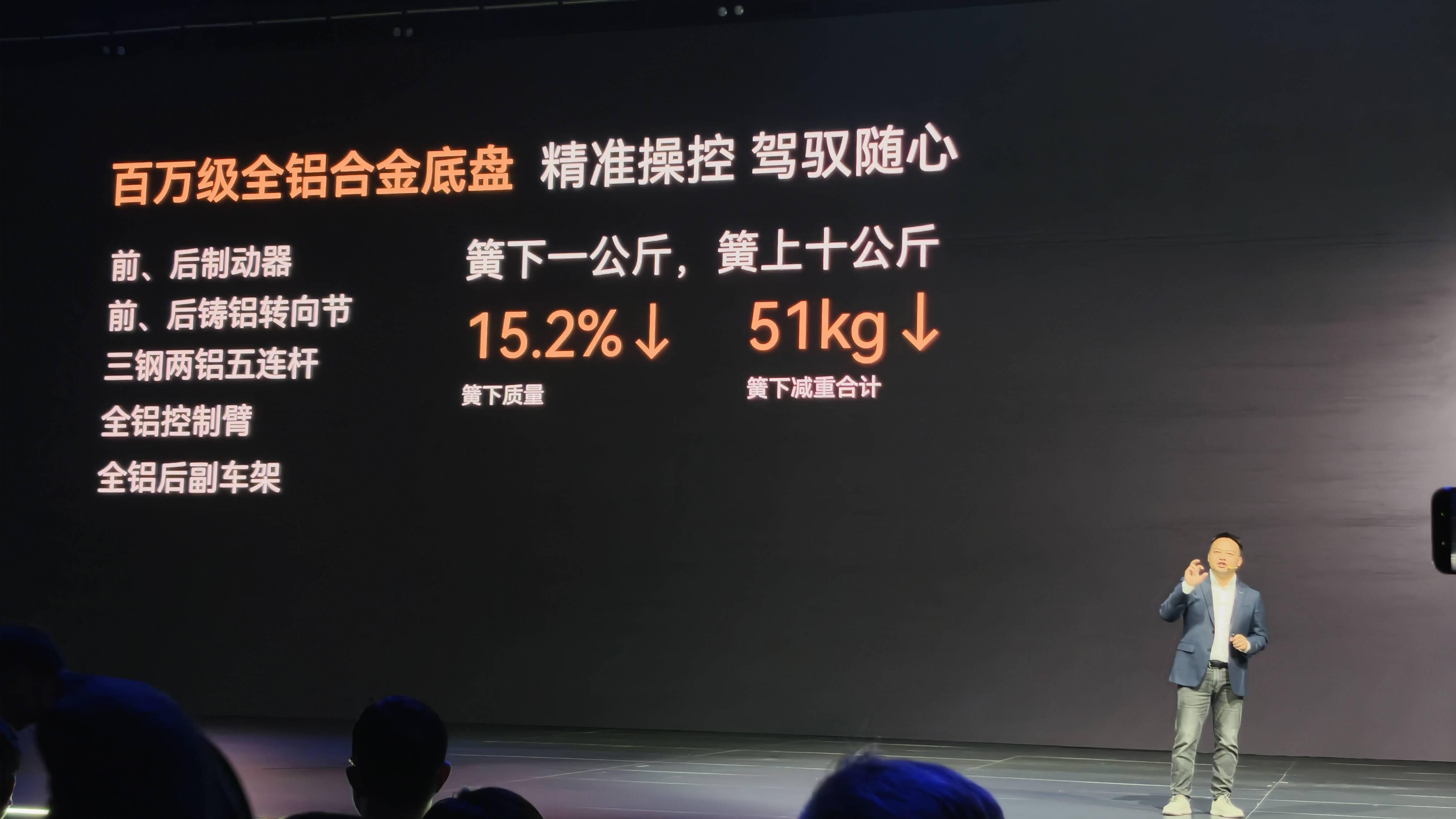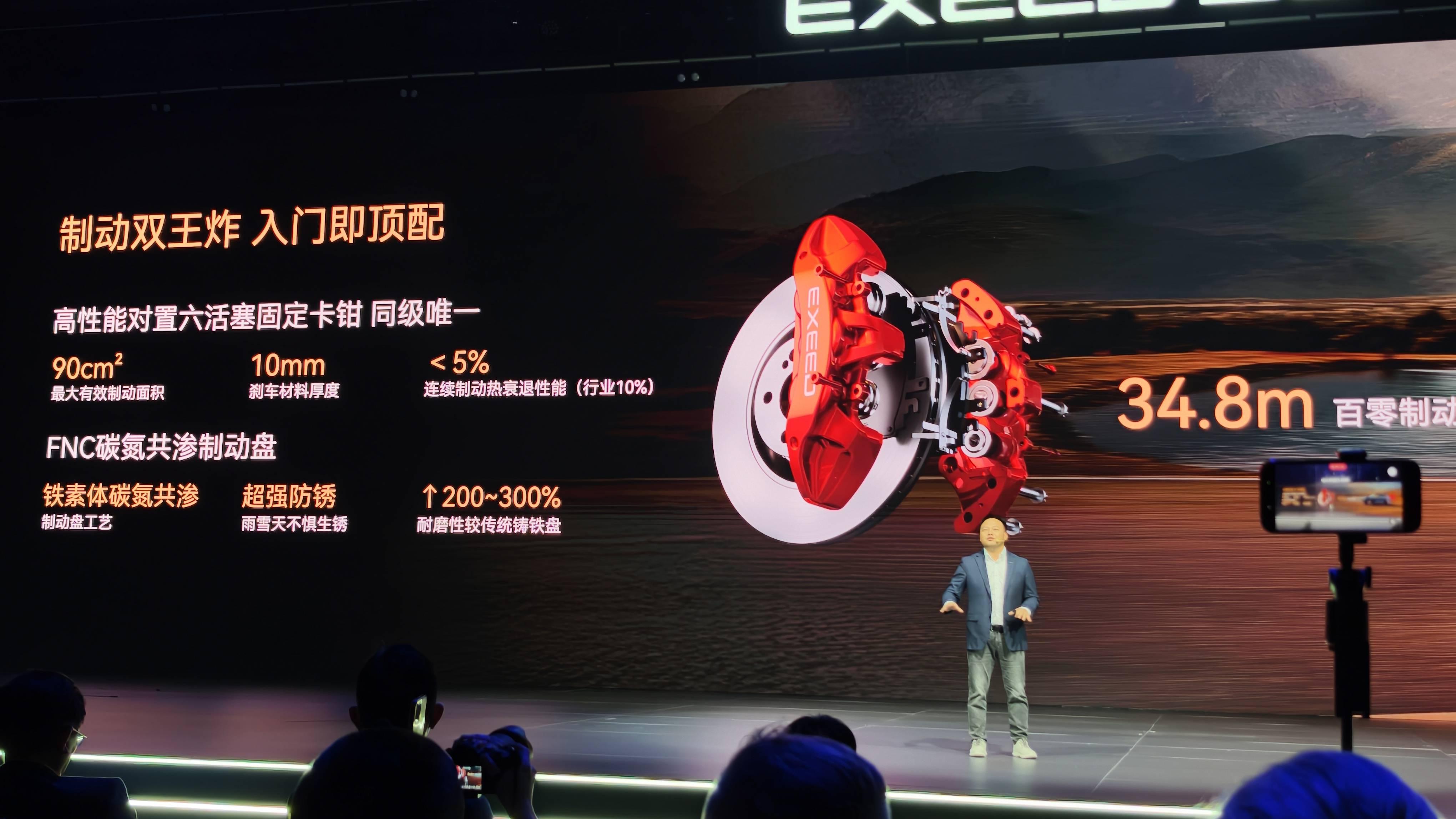 整場發佈會花去最多時間拆解的,是那套全球首搭的航空級 EMB 線控制動系統。簡單來說,它徹底拋棄了汽車用了一百多年的液壓剎車管路,直接用電信號控制電機來夾緊剎車盤。