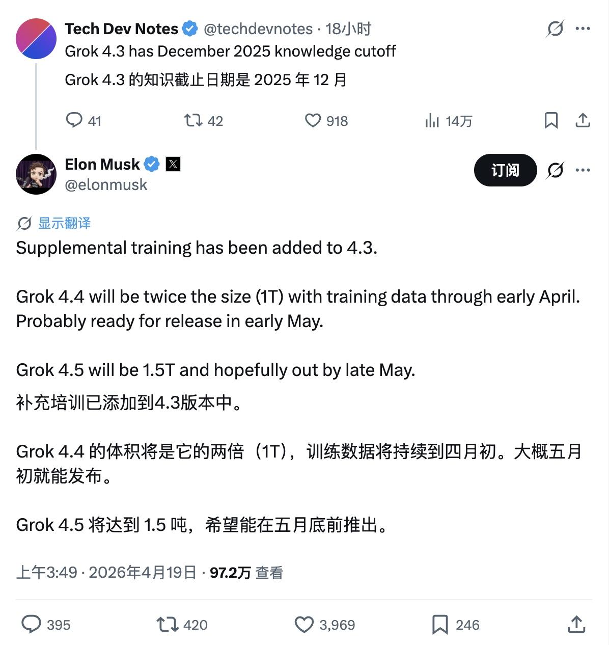 - Grok 4.4 參數規模將翻倍至 1T,訓練數據覆蓋至今年 4 月初,預計今年 5 月初發布;