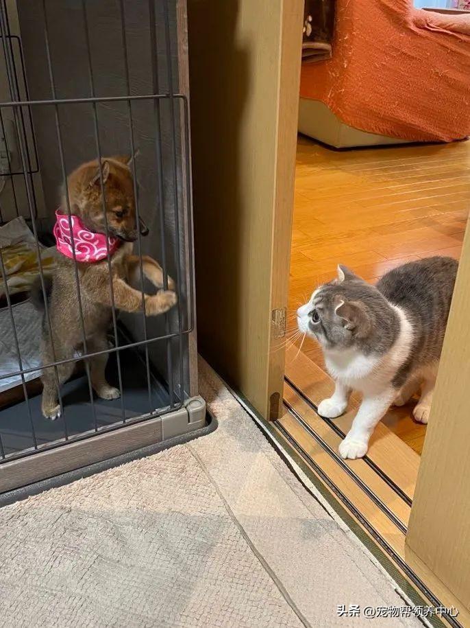 當兩個毛孩子第一次相見時,小梅就很興奮,它扒着籠子門不停地搖着尾巴,毫不掩飾自己的好奇。