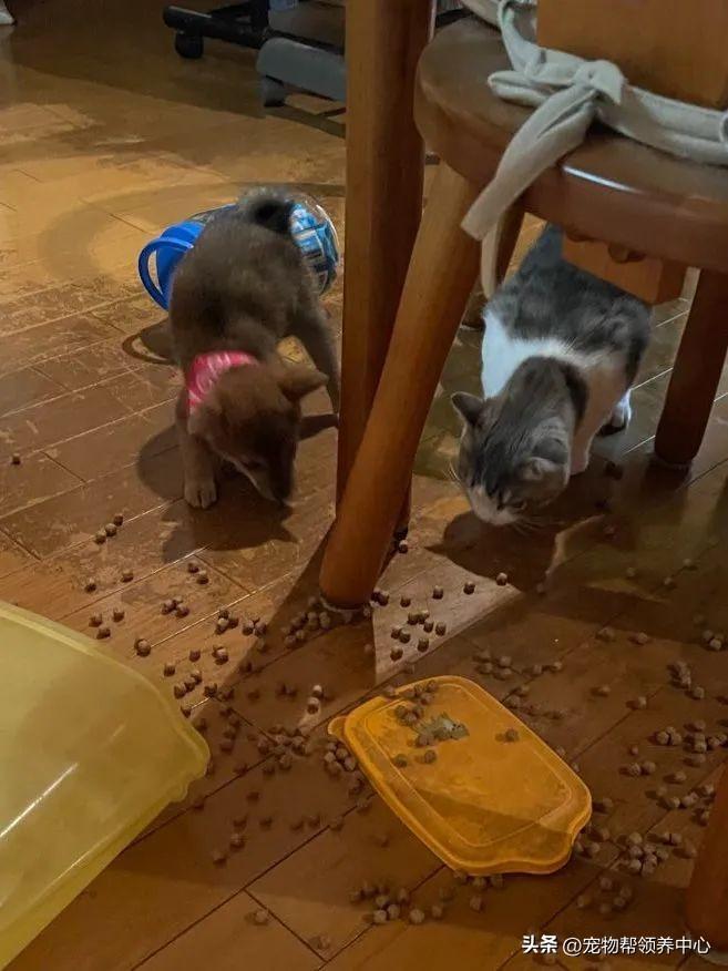 一貓一狗聯合作案橫掃狗糧桶,被當場抓包後還一臉無辜,差點氣死