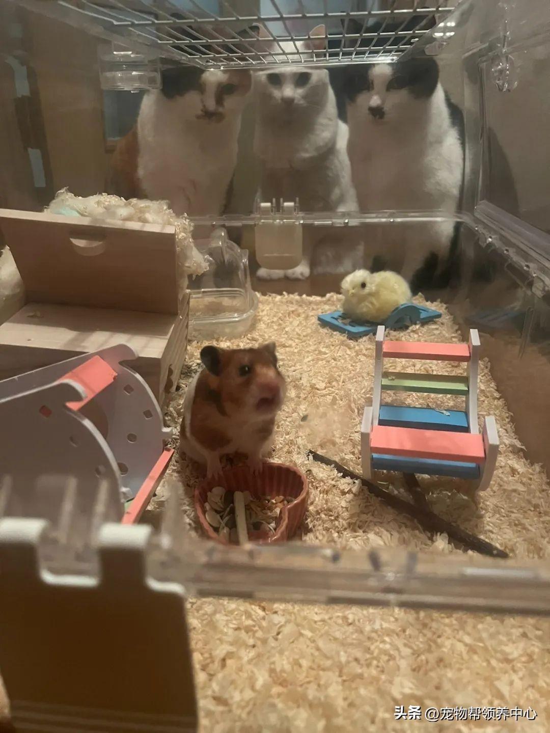 小倉鼠被三隻貓咪緊盯,壓迫感撲面而來,倉鼠:這是要嚇鼠我...