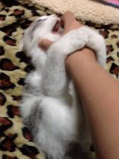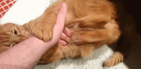 如果你和貓咪不是很熟,或是貓咪本身就很敏感,那麼它是不會把它敏感的部位暴露給人類,尤其是它的肚子,不會給人碰,給人摸,如果你要摸它的肚皮,那麼貓咪很可能會拒絕你,它抱着你手兔子蹬,還會咬你的手!警告你,不要再碰它的肚子,否則它就不客氣了,要攻擊你,或是溜走了~
