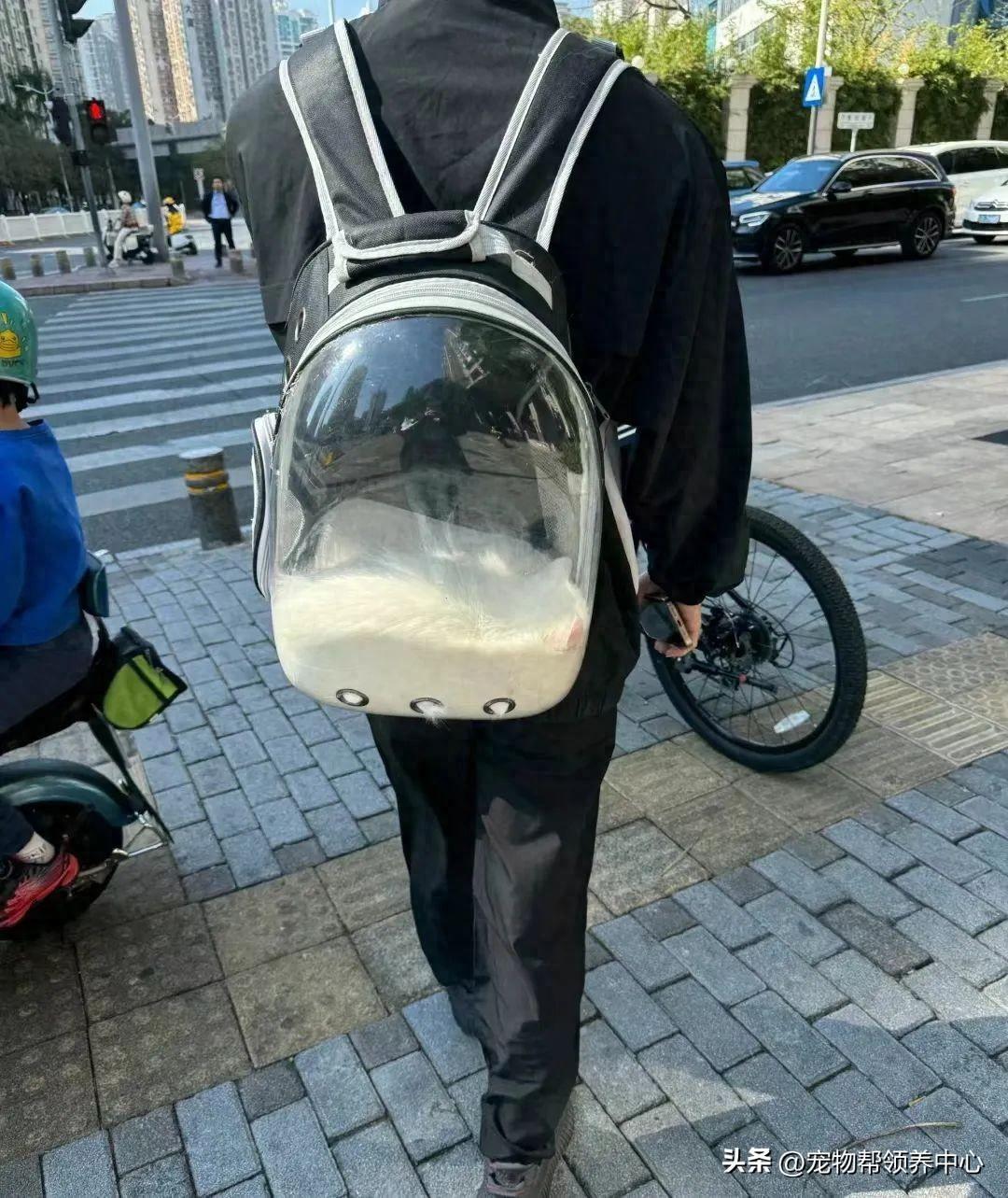 只見一名男子背上揹着一個寵物外出用的貓包,但貓包裏面根本看不到貓咪....
