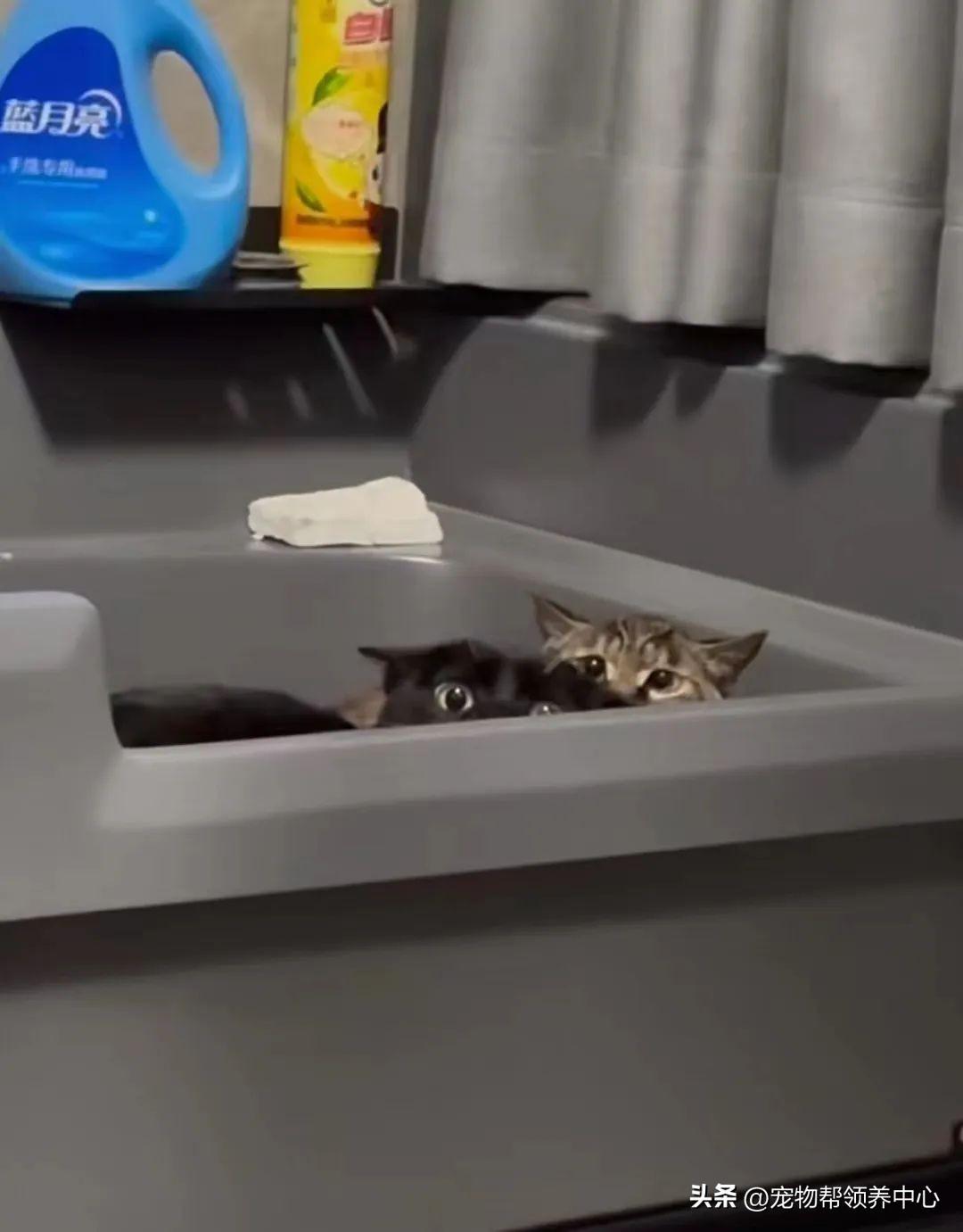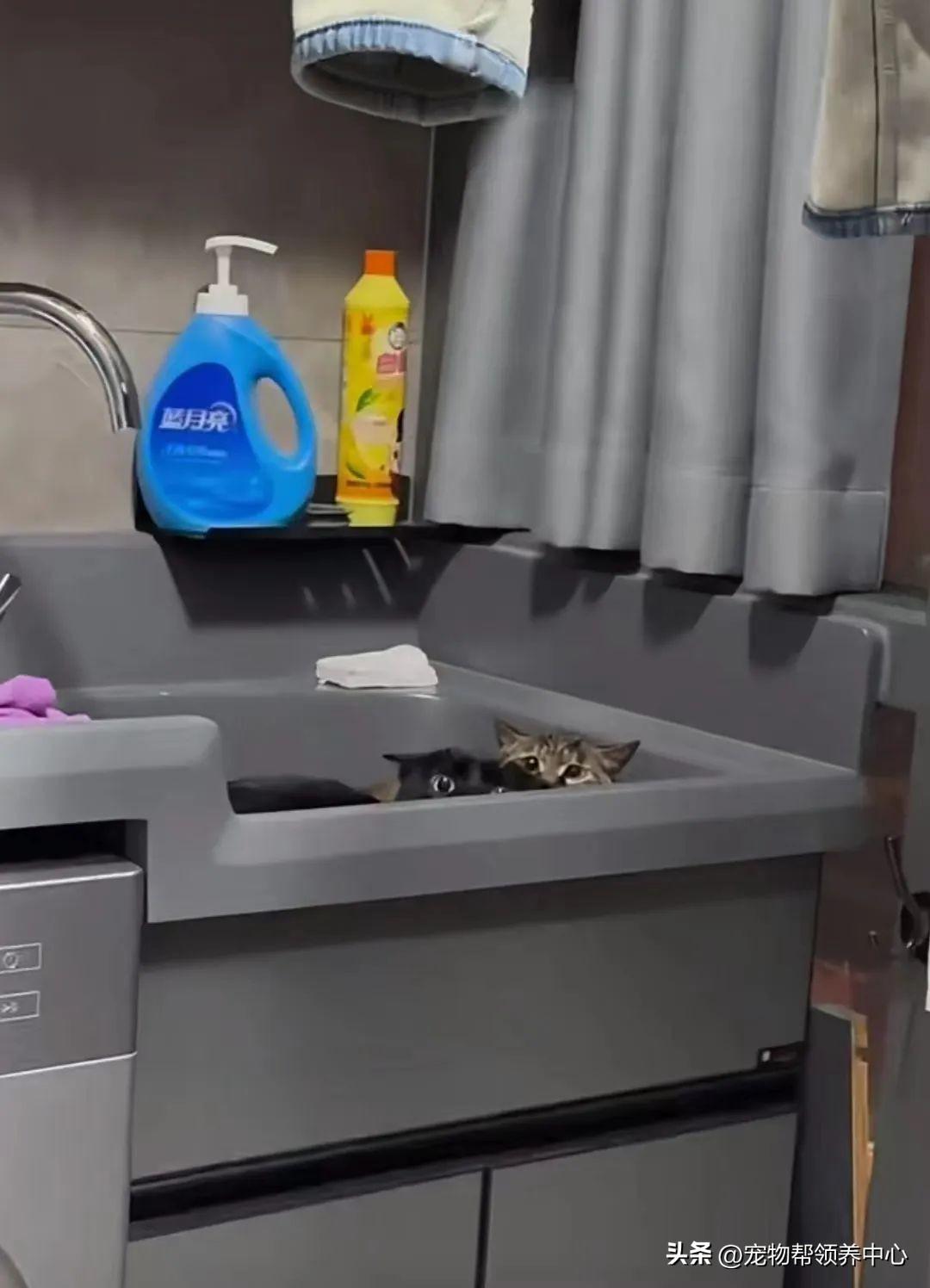 網友找了好半天都沒發現貓咪在哪裏,結果找了好久才發現貓咪們竟躲在廚房洗碗槽那邊,跟一堆沒洗的碗盤待在一起。