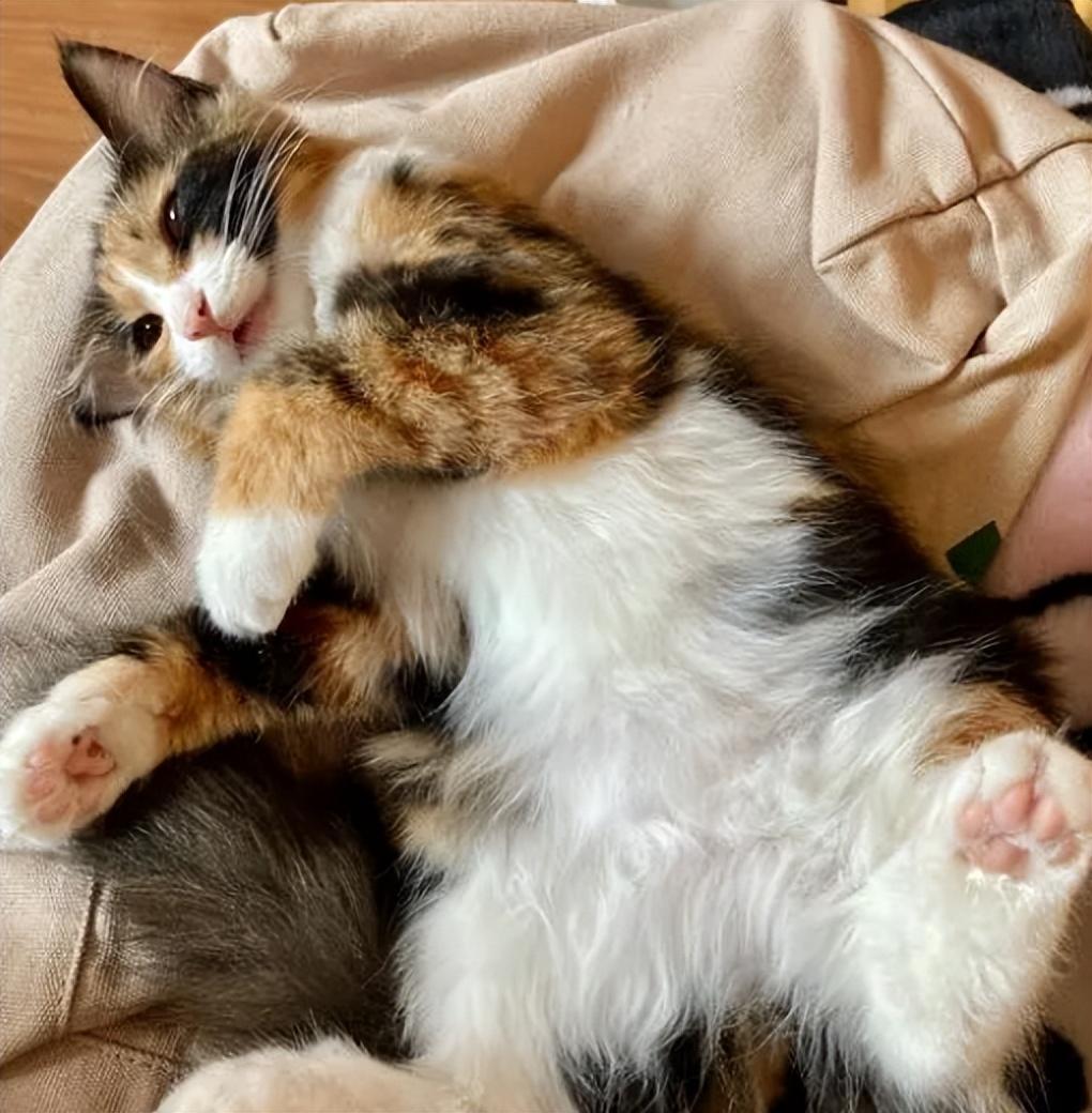 不僅如此,三花貓還特別喜歡主人的撫摸,輕輕撓兩下,就開始發出呼嚕呼嚕的聲音,還忍不住人開始踩奶,非常可愛。