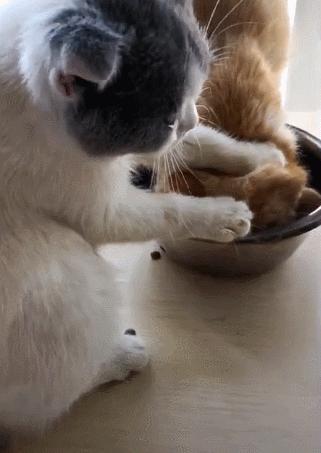 貓咪都有愛“搶飯”的毛病,總覺得對方碗裏的糧比自己的要香。所以主人最好分開兩個食碗餵養,在平時也要多注意觀察,如果有“搶飯”的現象要及時將它們分開,免得出現一隻餓肚子,一隻卻喫得太撐。