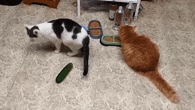 黃瓜在我們生活中很常見,也平平無奇,但對於貓咪來說,這可是剋星般的存在。尤其是在貓咪專心做某件事的時候,黃瓜突然出現在它的視野裏,會嚇到貓咪跳起來。