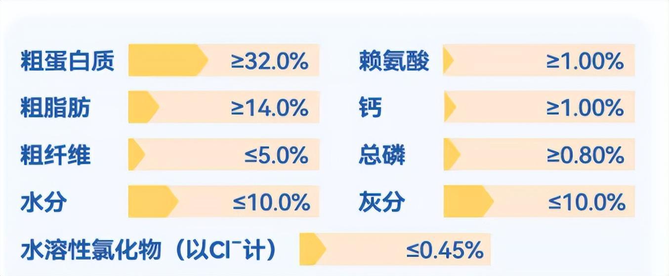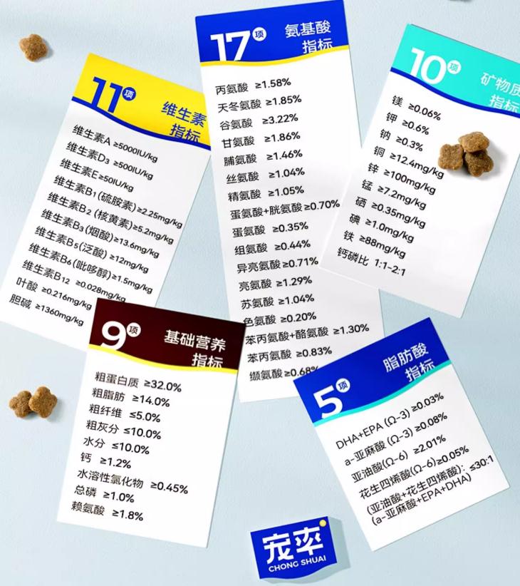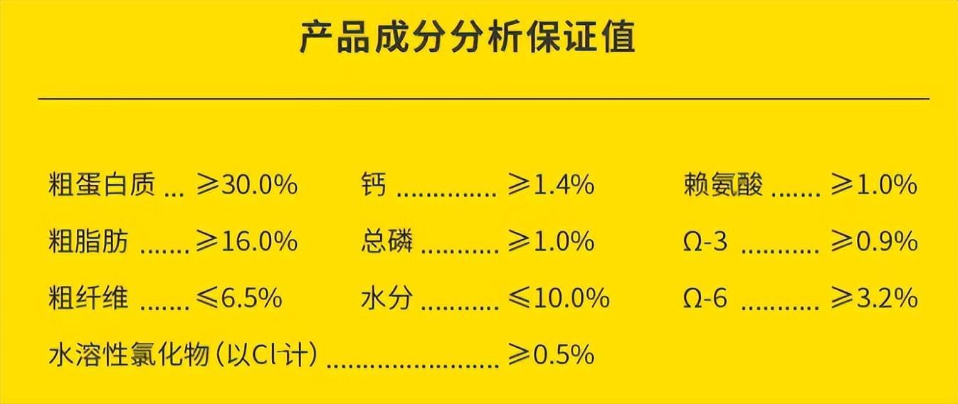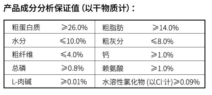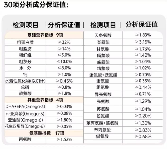 肉類及其製品(雞肉粉、羊肉粉、羊肉骨粉、凍羊肉5%)、大米、去皮豌豆、雞油、馬鈴薯粉、燕麥、蛋黃粉、雞水解粉、亞麻籽、蔓越莓粉、魚油(1%)、胡蘿蔔粉、南瓜、西紅柿粉、螺旋藻粉、乳鈣、葡萄糖胺鹽酸鹽(0.08%)、絲蘭粉(0.05%)