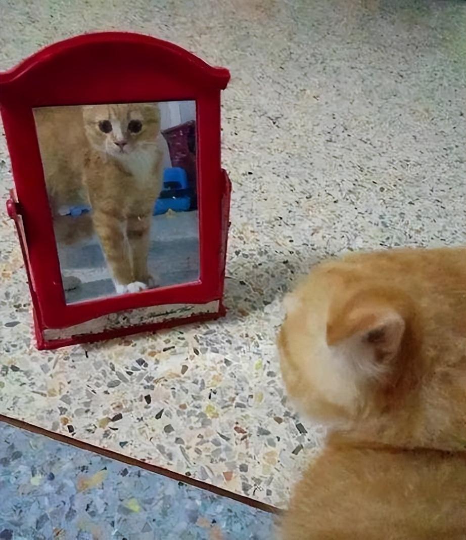 貓咪第一次看到鏡子裏的自己,或許會被嚇到,這是沒問題的。但如果每次路過都能被嚇到,那這樣的貓咪也是一隻“小笨貓”。