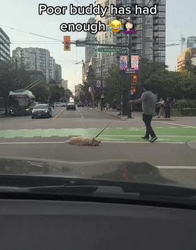 1、有的小狗,擺爛起來那是完全不看地點。哪怕是在馬路中央,只要累了就馬上躺下,徒留主人在那不知所措,非常迷茫。
